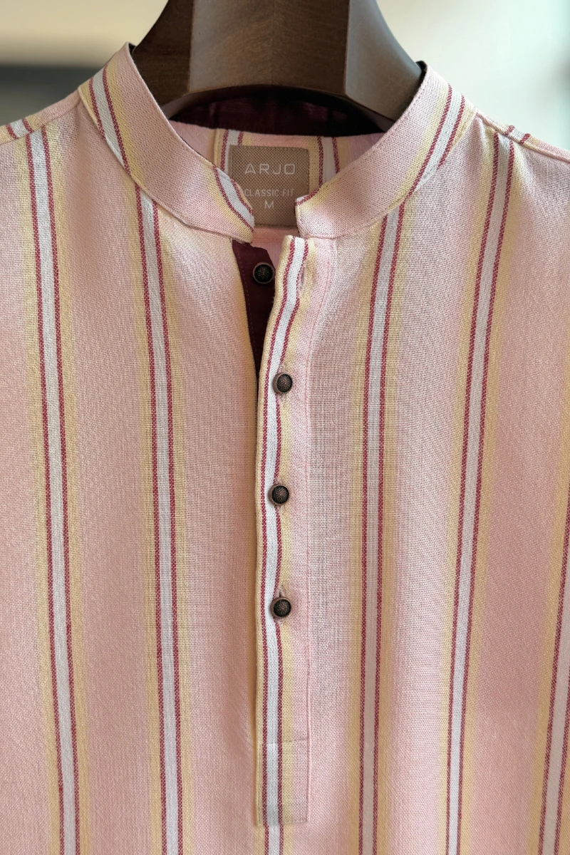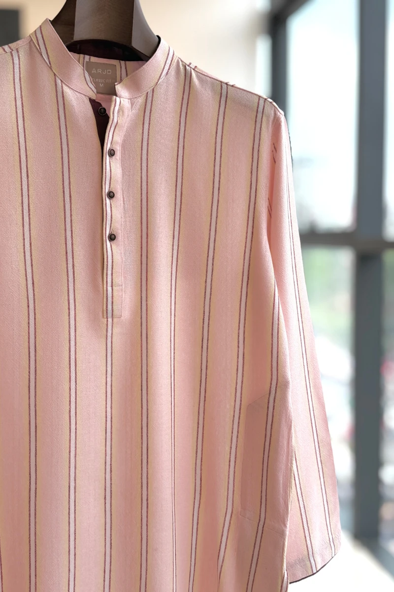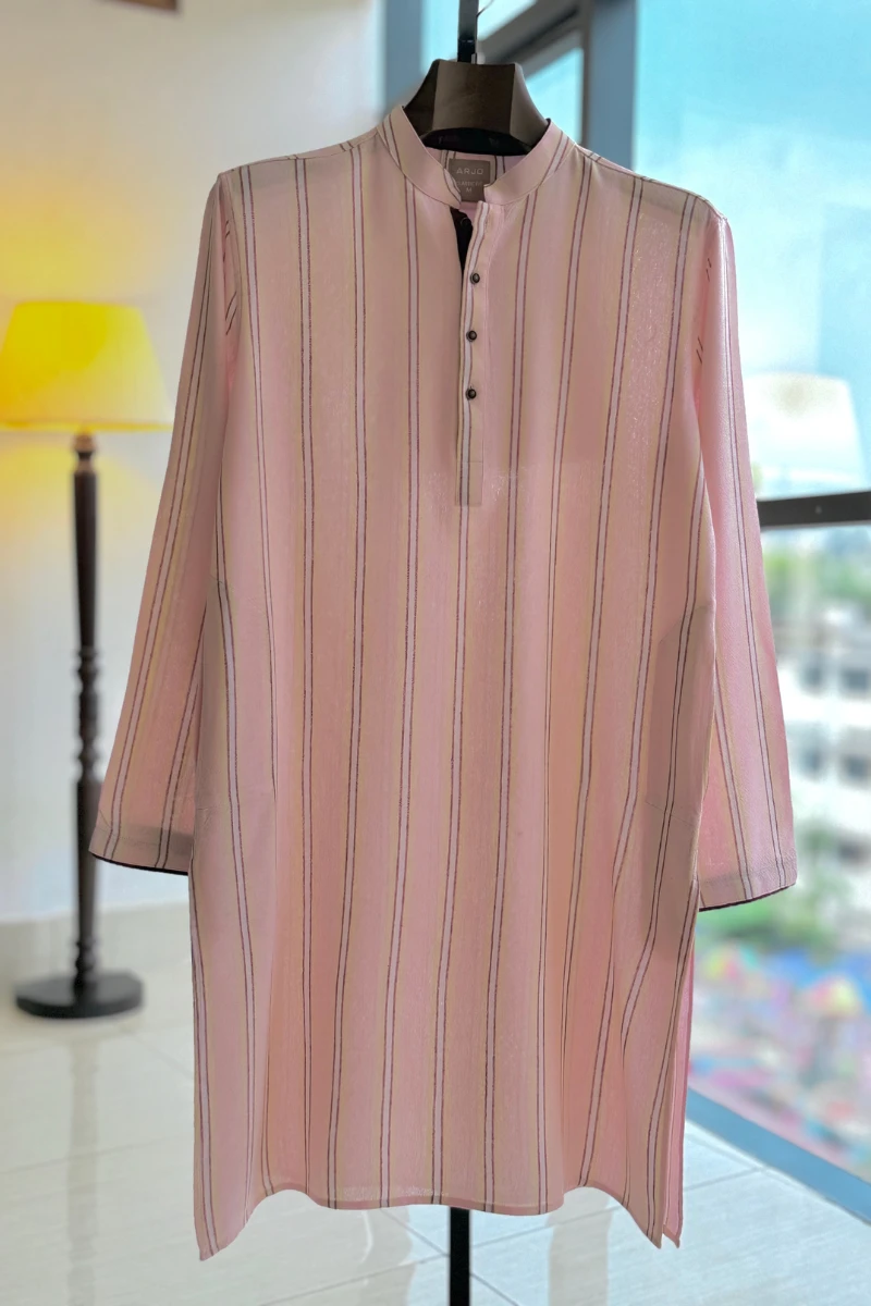 Experience timeless elegance with Arjo’s Baby Pink Base with White, Red & Light Yellow Striped Panjabi This Panjabi offers a breathable, soft feel, ensuring effortless wear throughout the day. Designed with a tailored fit, it seamlessly blends tradition with modern sophistication, making it perfect for any occasion, be it casual gatherings or festive celebrations. If you're looking for high-quality Punjabi for men in BD, this refined piece is a must-have in your collection. Elevate your style with Arjo today!