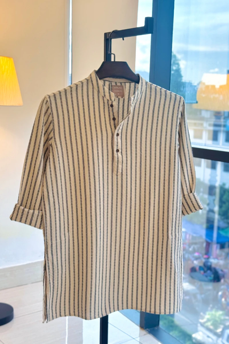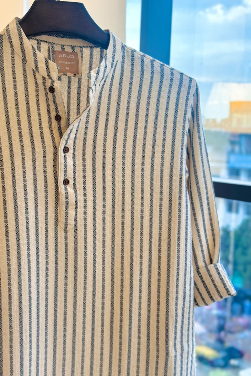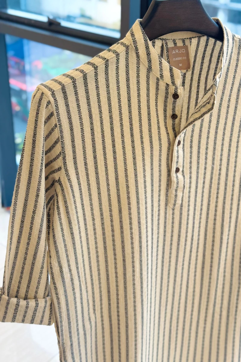 The Beige & Black Striped Mandarin Collar Kurta from Arjo is a perfect blend of style and comfort. This full-sleeve katua offers a breathable and soft feel, making it ideal for all-day wear. Designed for a sophisticated look, its classic fit suits both casual and formal occasions. If you're searching for high-quality katua for men in BD, this elegant piece is a must-have for your collection. Upgrade your style with Arjo today!
