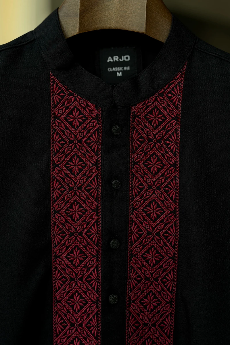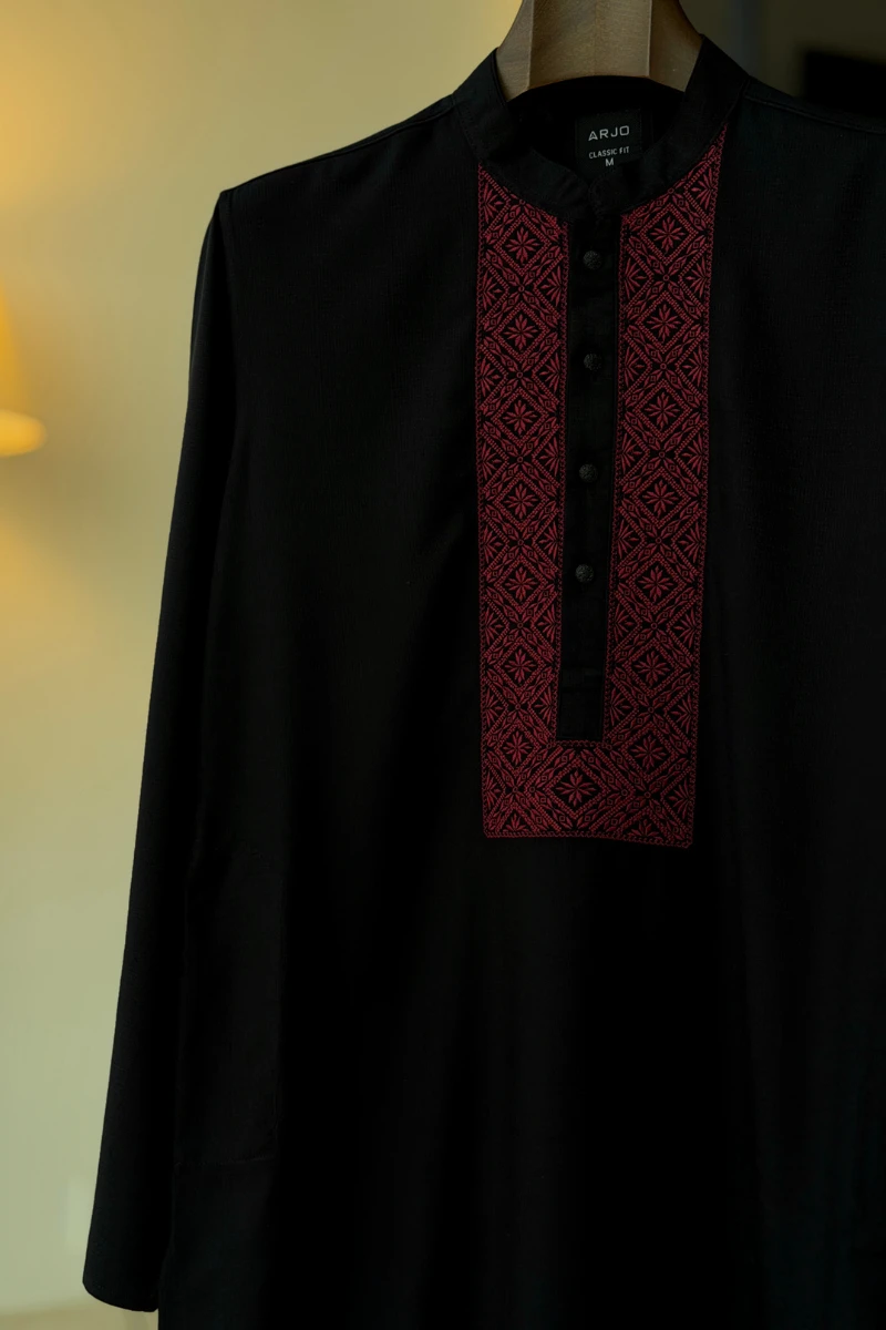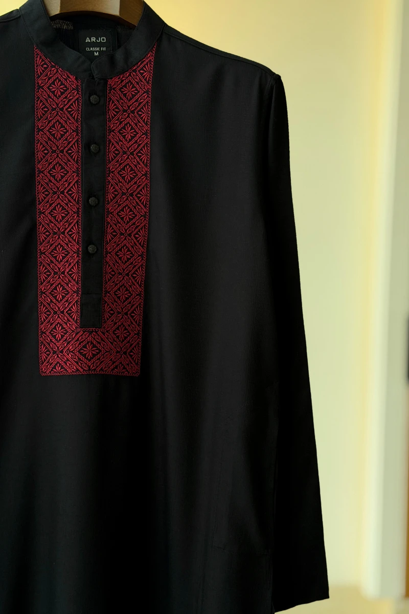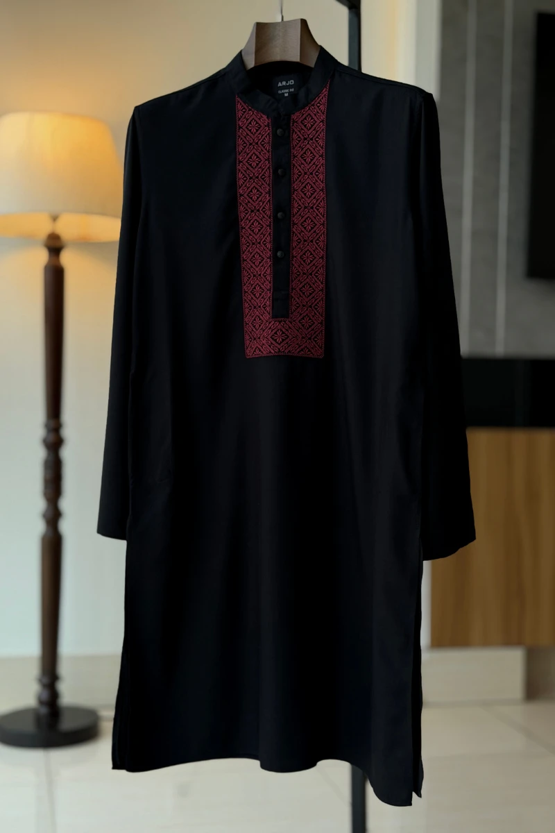 Experience timeless elegance with Arjo’s Black With Contrast Embroidery Panjabi This Panjabi offers a breathable, soft feel, ensuring effortless wear throughout the day. Designed with a tailored fit, it seamlessly blends tradition with modern sophistication, making it perfect for any occasion, be it casual gatherings or festive celebrations. If you're looking for high-quality Punjabi for men in BD, this refined piece is a must-have in your collection. Elevate your style with Arjo today!