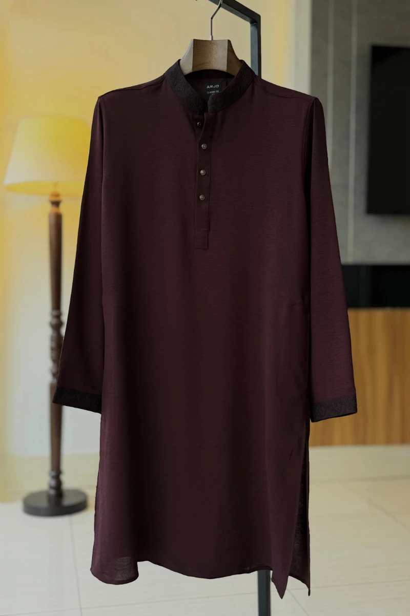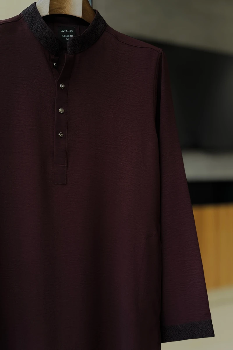 Experience timeless elegance with Arjo’s Blackberry with Black Contrast Embroidered Panjabi This Panjabi offers a breathable, soft feel, ensuring effortless wear throughout the day. Designed with a tailored fit, it seamlessly blends tradition with modern sophistication, making it perfect for any occasion, be it casual gatherings or festive celebrations. If you're looking for high-quality Punjabi for men in BD, this refined piece is a must-have in your collection. Elevate your style with Arjo today!