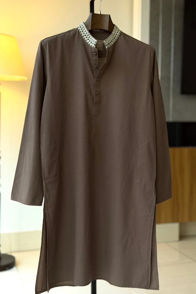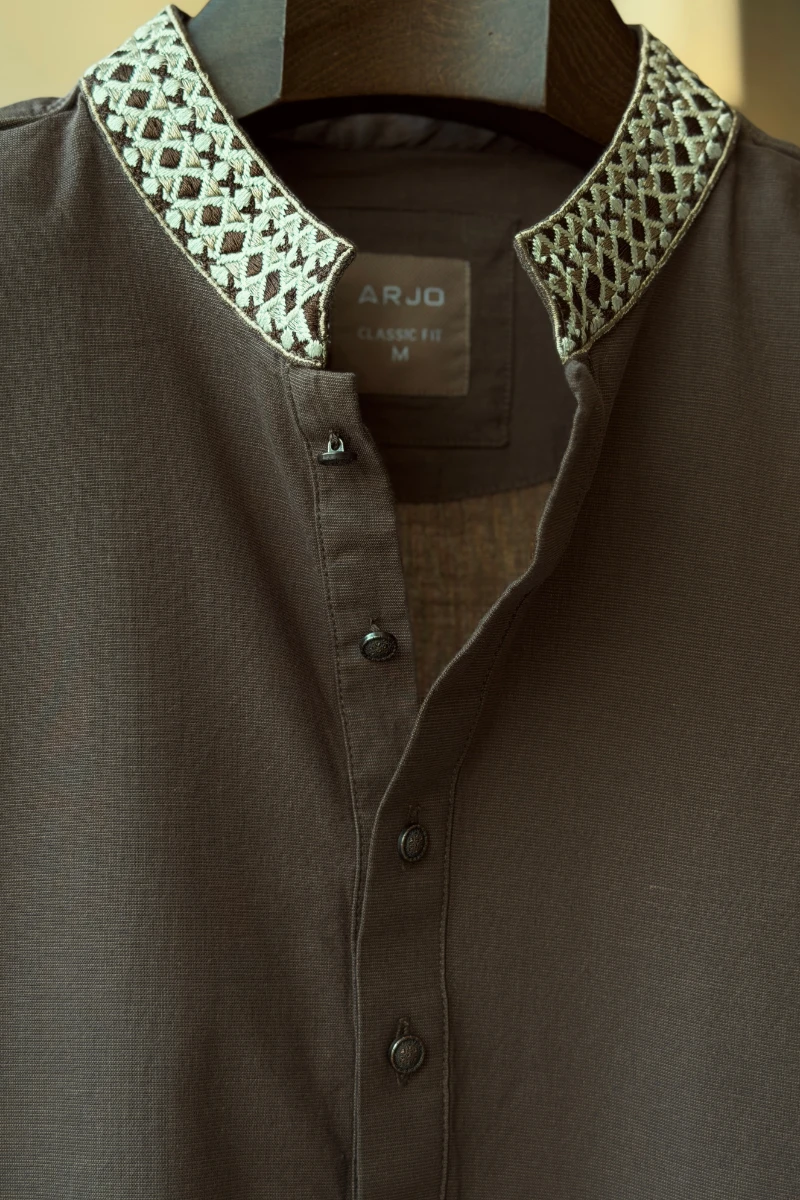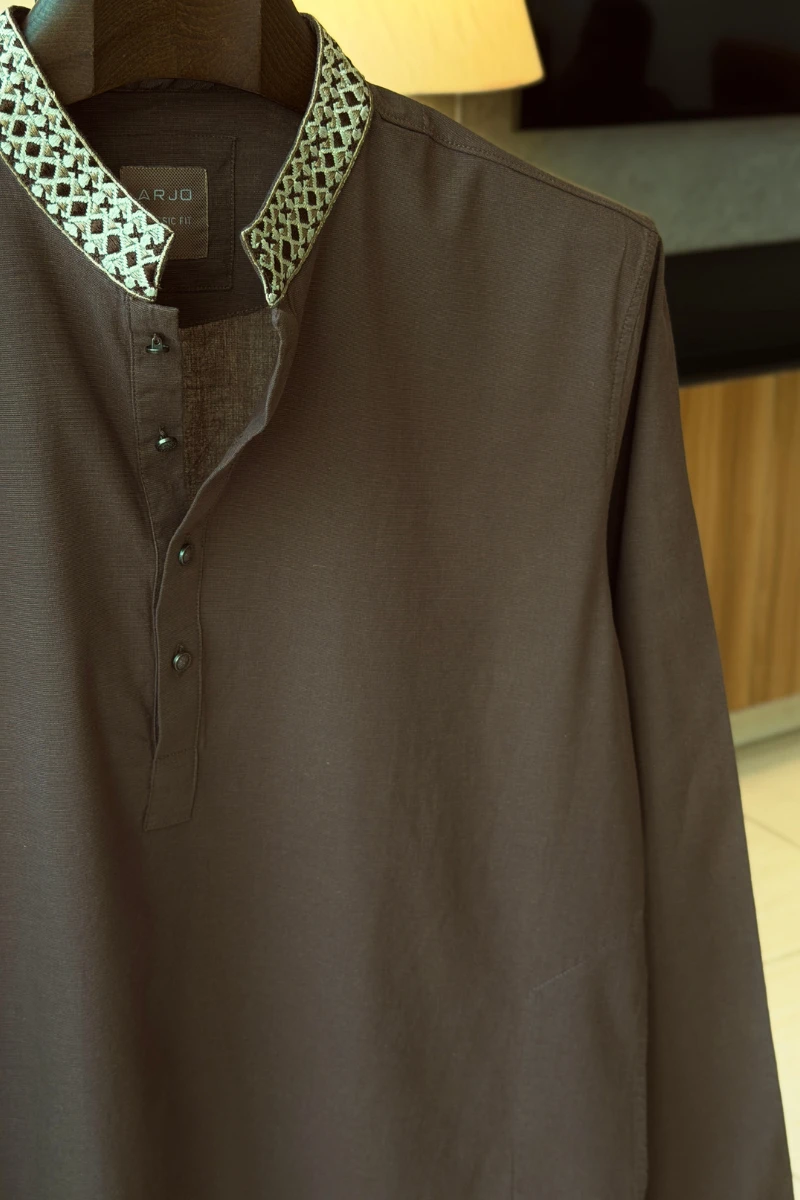 Experience timeless elegance with Arjo’s Chocolate Brown with Embroidered Collar Panjabi This Panjabi offers a breathable, soft feel, ensuring effortless wear throughout the day. Designed with a tailored fit, it seamlessly blends tradition with modern sophistication, making it perfect for any occasion, be it casual gatherings or festive celebrations. If you're looking for high-quality Punjabi for men in BD, this refined piece is a must-have in your collection. Elevate your style with Arjo today!