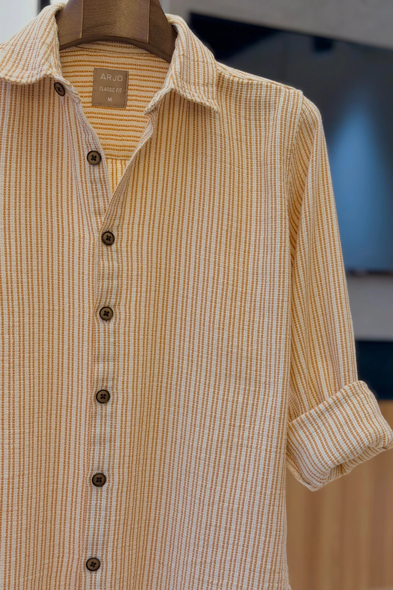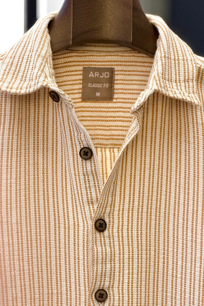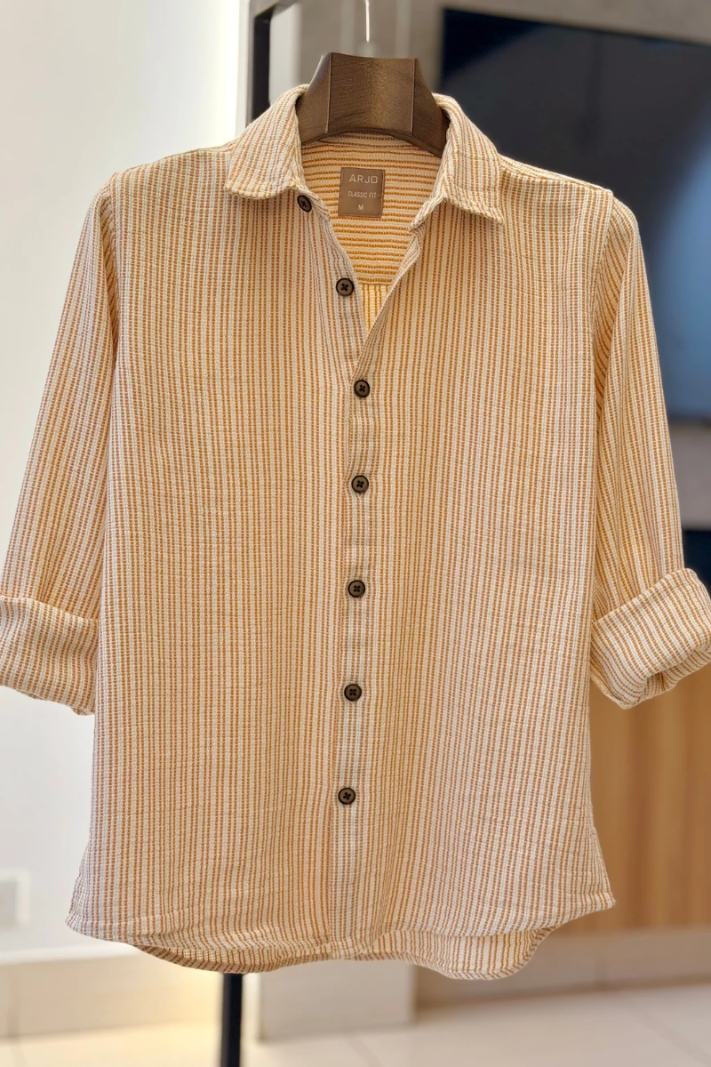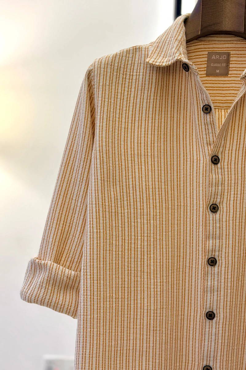 The Cream With Camel Stripes Shirt from Arjo is the perfect choice for effortless summer style. Crafted for comfort and breathability, this lightweight shirt keeps you cool during warmer days. With its relaxed fit and timeless stripes, it’s ideal for both casual outings and laid-back occasions. If you're looking for premium Full-sleeve shirts for men in BD, this versatile piece is a must-have. Stay stylish and comfortable all season long with Arjo. GSM 220-240