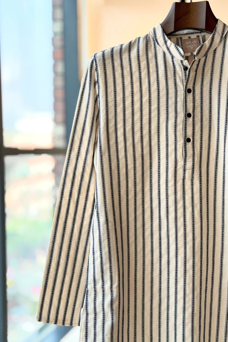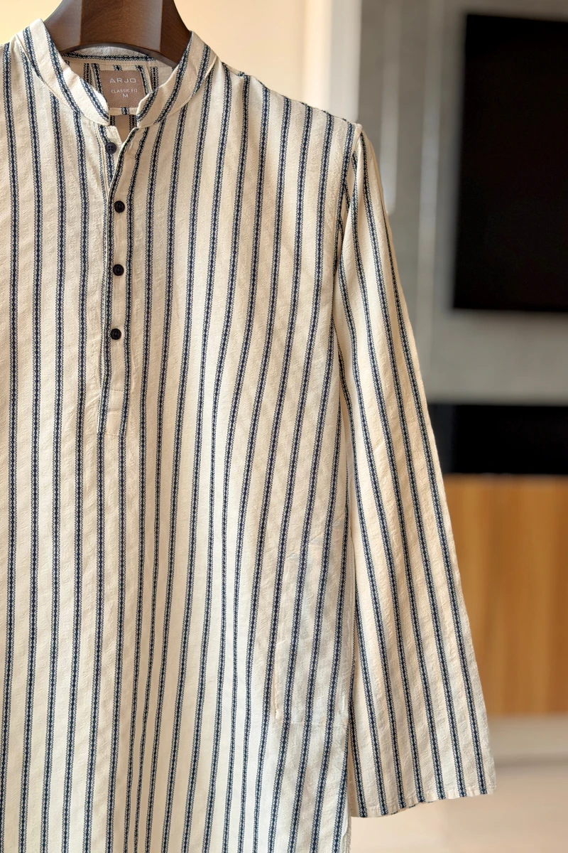 The Cream With Navy Blue Vertical Stripe Short Panjabi from Arjo is a perfect blend of style and comfort. This full-sleeve Short Panjabi offers a breathable and soft feel, making it ideal for all-day wear. Designed for a sophisticated look, its classic fit suits both casual and formal occasions. If you're searching for high-quality Short Panjabi for men in BD, this elegant piece is a must-have for your collection. Upgrade your style with Arjo today!