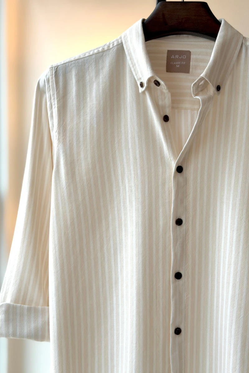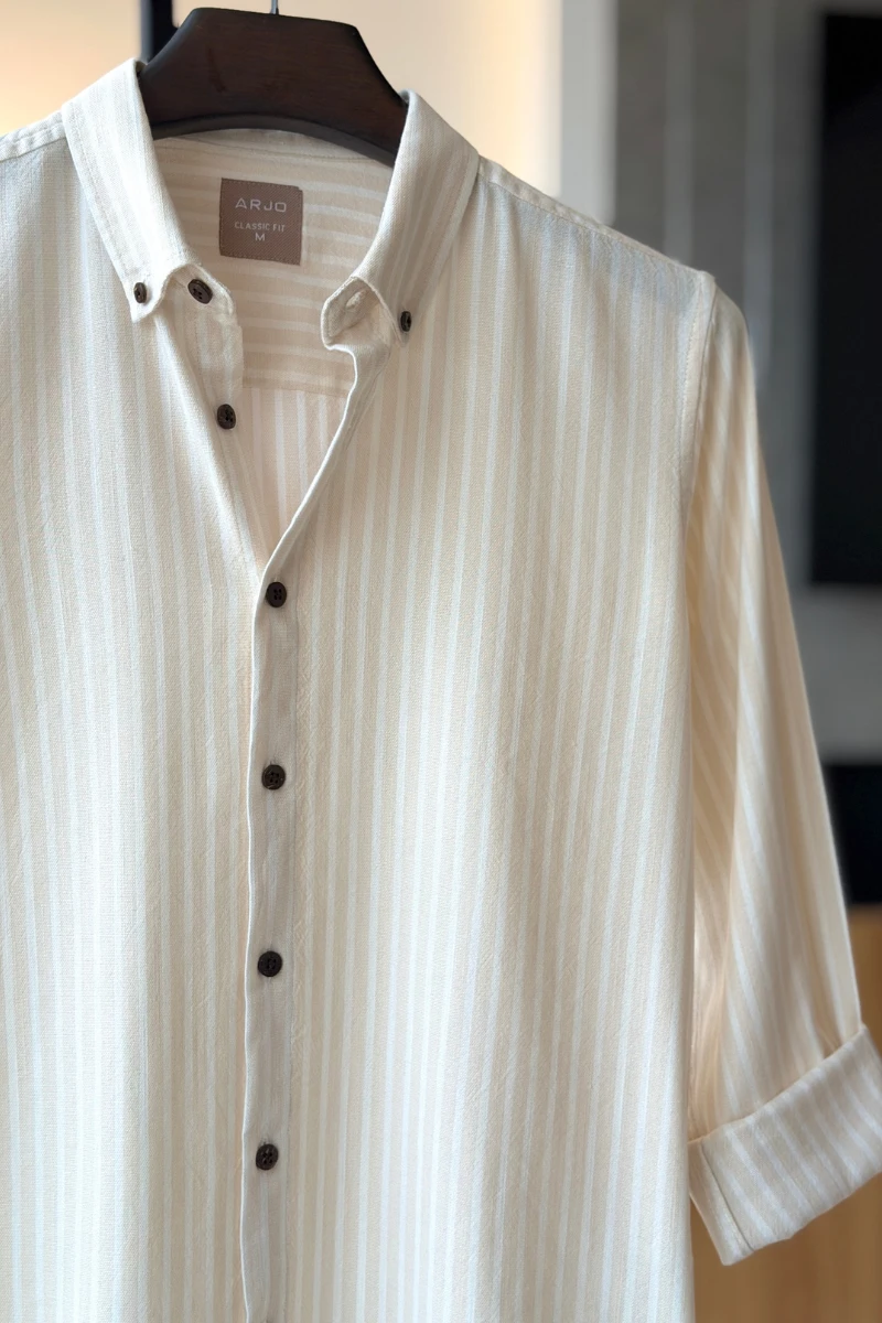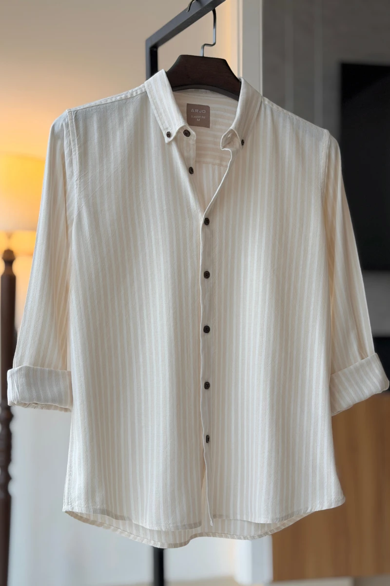 The Cream With White Stripes Shirt from Arjo is the perfect choice for effortless summer style. Crafted for comfort and breathability, this lightweight shirt keeps you cool during warmer days. With its relaxed fit and timeless stripes, it’s ideal for both casual outings and laid-back occasions. If you're looking for premium Full-sleeve shirts for men in BD, this versatile piece is a must-have. Stay stylish and comfortable all season long with Arjo.