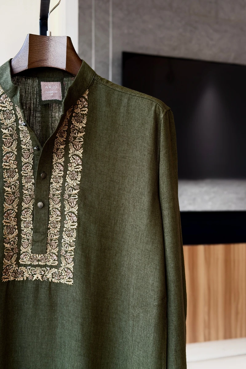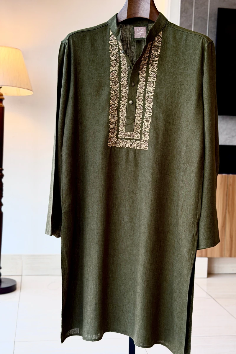 Experience timeless elegance with Arjo’s Dark Green with Contrast Embroidered Panjabi This Panjabi offers a breathable, soft feel, ensuring effortless wear throughout the day. Designed with a tailored fit, it seamlessly blends tradition with modern sophistication, making it perfect for any occasion, be it casual gatherings or festive celebrations. If you're looking for high-quality Punjabi for men in BD, this refined piece is a must-have in your collection. Elevate your style with Arjo today!