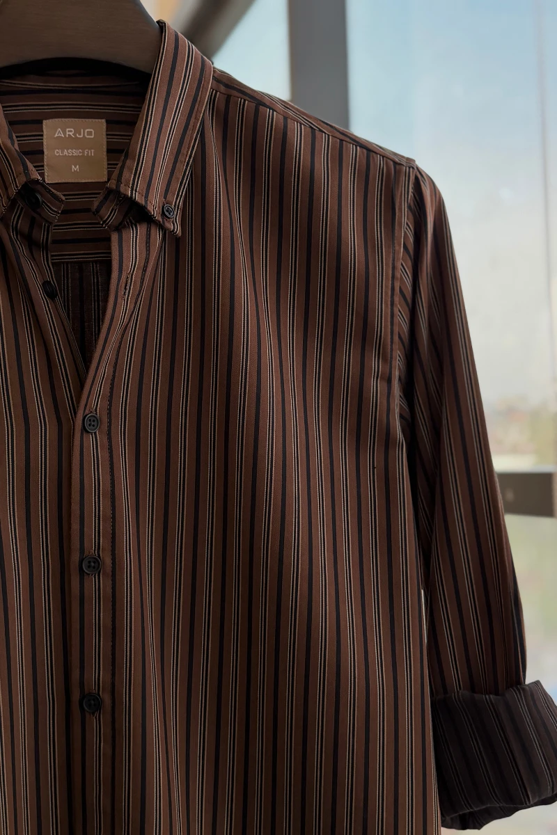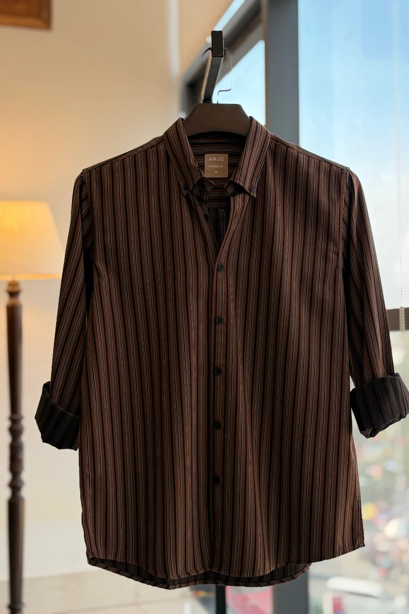 The Deep Chocolate Brown With Vertical Stripes Shirt from Arjo is the perfect choice for effortless summer style. Crafted for comfort and breathability, this lightweight shirt keeps you cool during warmer days. With its relaxed fit and timeless stripes, it’s ideal for both casual outings and laid-back occasions. If you're looking for premium Full-sleeve shirts for men in BD, this versatile piece is a must-have. Stay stylish and comfortable all season long with Arjo.