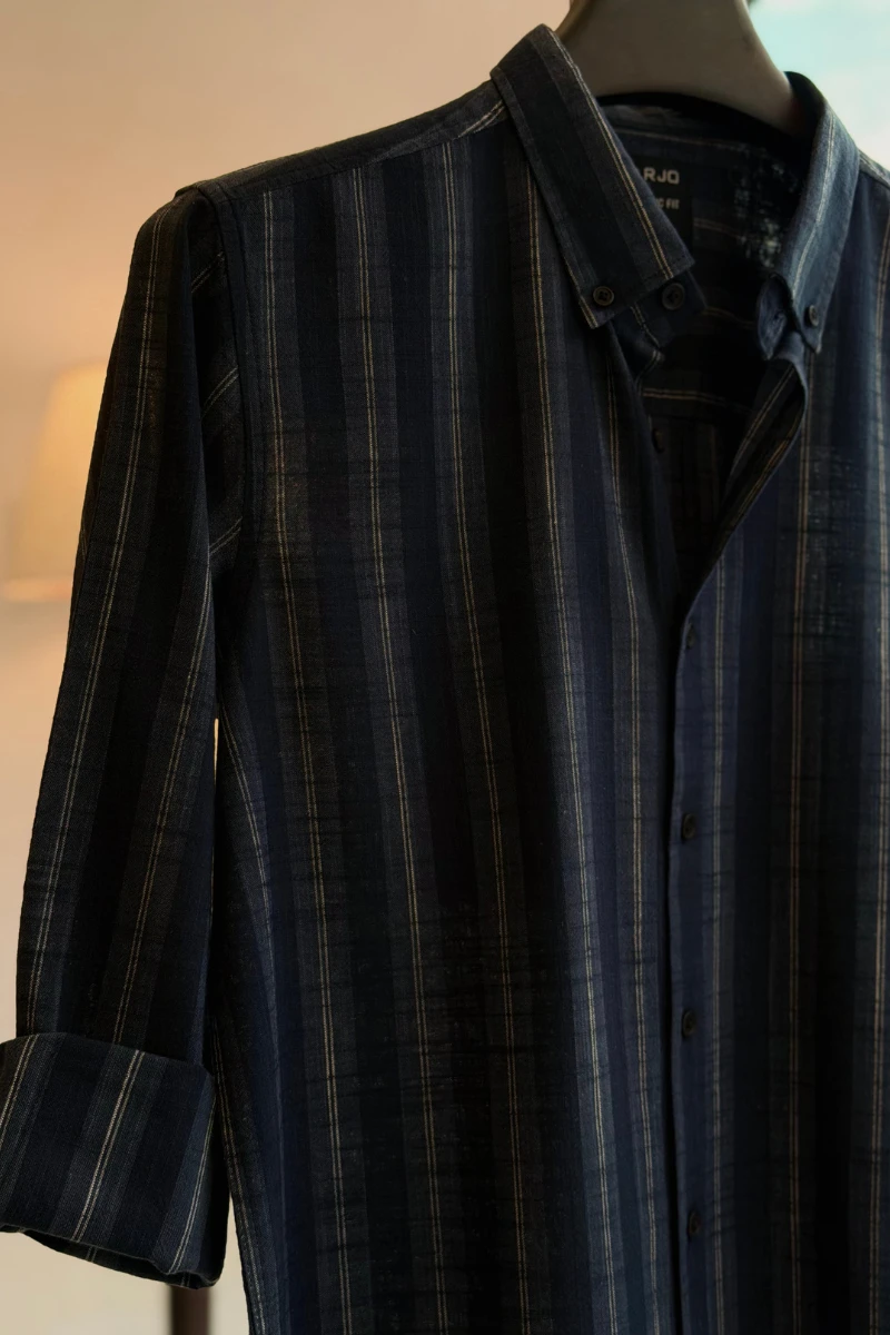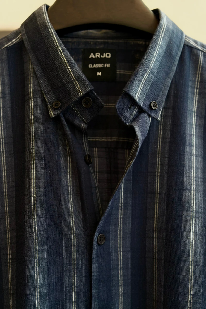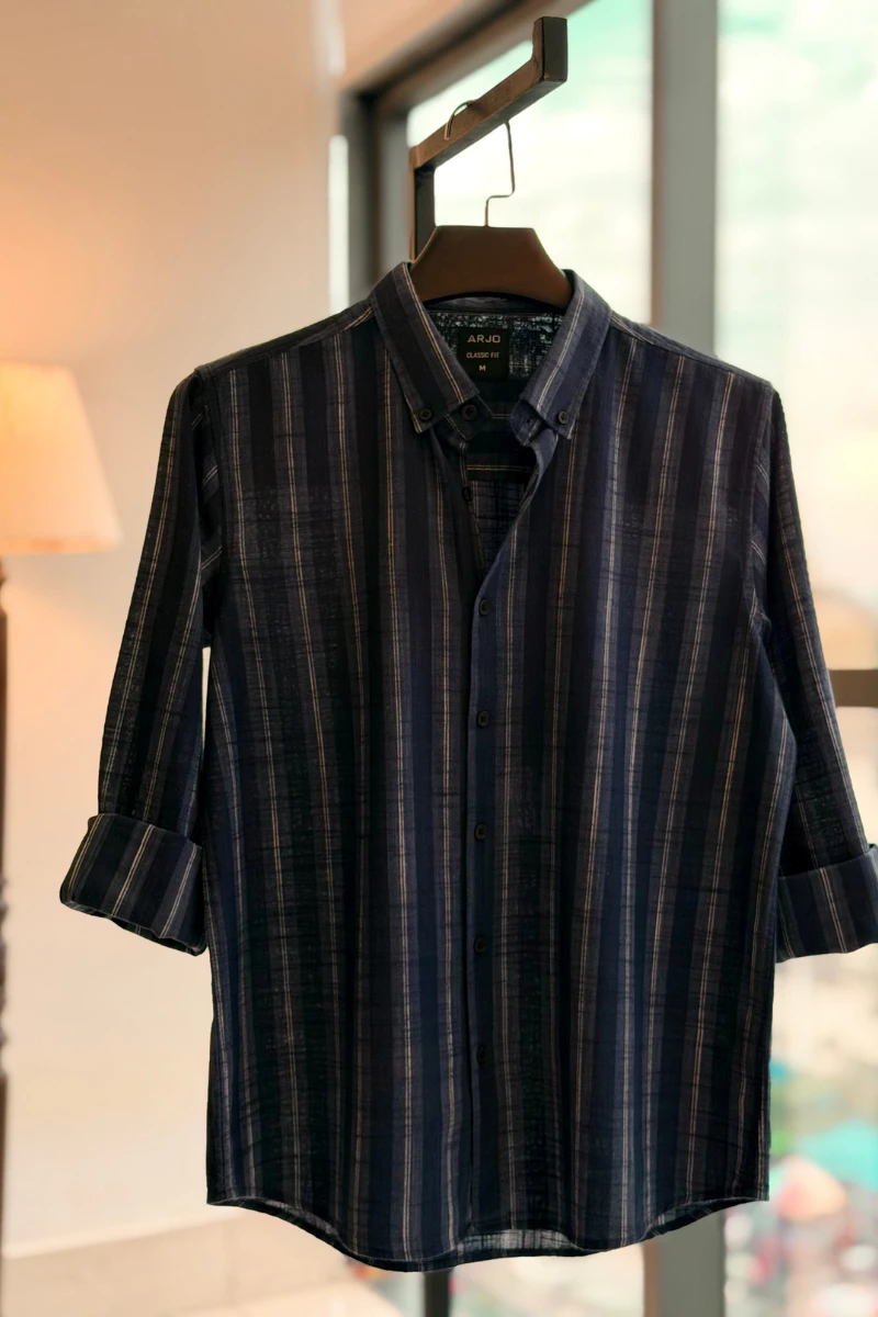 The Deep Navy Base With Subtle White Vertical Stripes from Arjo is the perfect choice for effortless summer style. Crafted for comfort and breathability, this lightweight shirt keeps you cool during warmer days. With its relaxed fit and timeless stripes, it’s ideal for both casual outings and laid-back occasions. If you're looking for premium Full-sleeve shirts for men in BD, this versatile piece is a must-have. Stay stylish and comfortable all season long with Arjo.