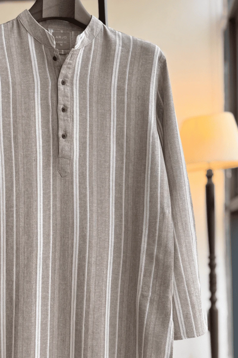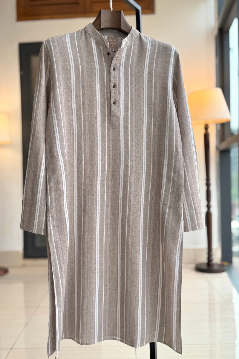 Experience timeless elegance with Arjo’s Greenish Beige with White and Beige Striped Panjabi This Panjabi offers a breathable, soft feel, ensuring effortless wear throughout the day. Designed with a tailored fit, it seamlessly blends tradition with modern sophistication, making it perfect for any occasion, be it casual gatherings or festive celebrations. If you're looking for high-quality Punjabi for men in BD, this refined piece is a must-have in your collection. Elevate your style with Arjo today!