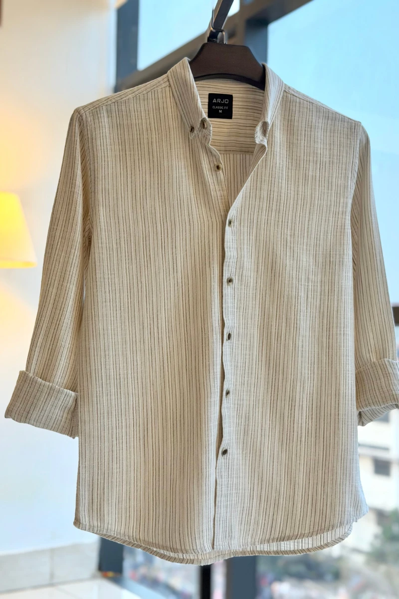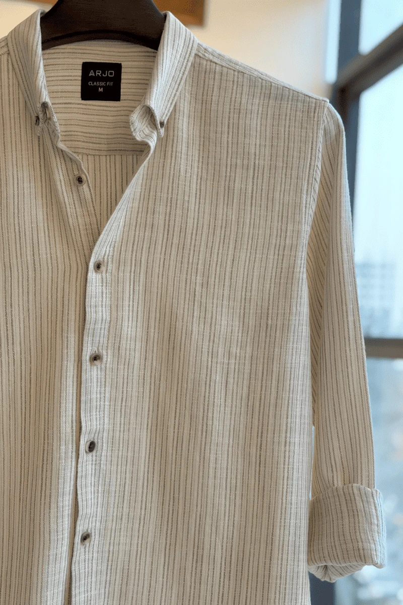 The Ivory Pinstripe Classic Shirt from Arjo is the perfect choice for effortless summer style. Crafted for comfort and breathability, this lightweight shirt keeps you cool during warmer days. With its relaxed fit and timeless stripes, it’s ideal for both casual outings and laid-back occasions. If you're looking for premium Full-sleeve shirts for men in BD, this versatile piece is a must-have. Stay stylish and comfortable all season long with Arjo.Fabrics : remi cotton GSM : 140/150.