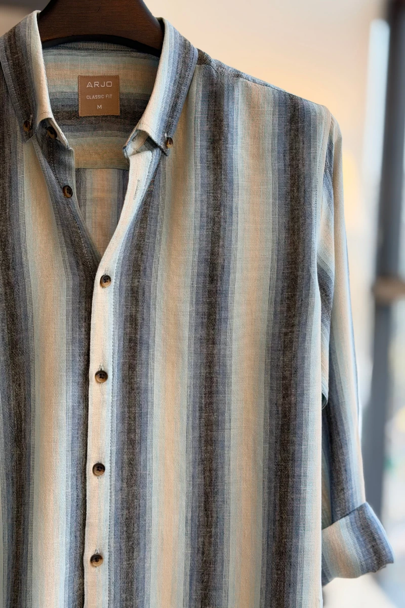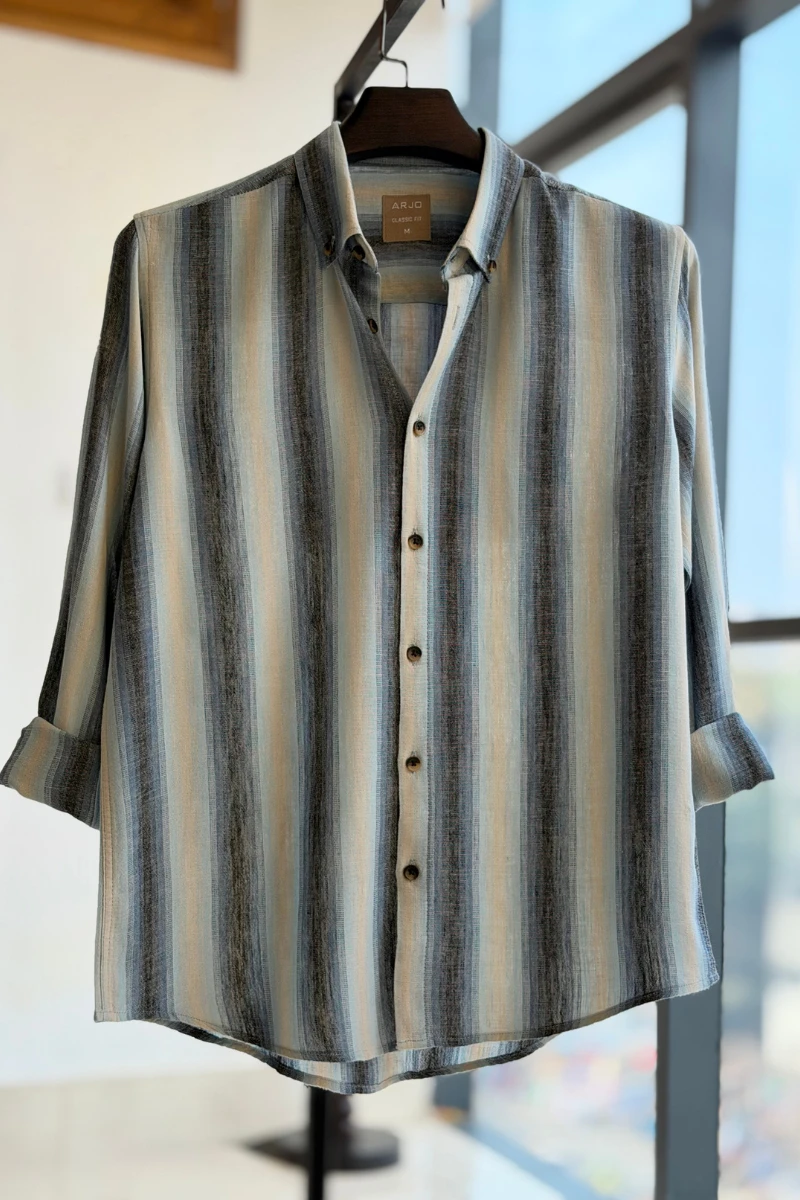 The Ivory With Blue And Charcoal Stripes Shirt from Arjo is the perfect choice for effortless summer style. Crafted for comfort and breathability, this lightweight shirt keeps you cool during warmer days. With its relaxed fit and timeless stripes, it’s ideal for both casual outings and laid-back occasions. If you're looking for premium Full-sleeve shirts for men in BD, this versatile piece is a must-have. Stay stylish and comfortable all season long with Arjo.