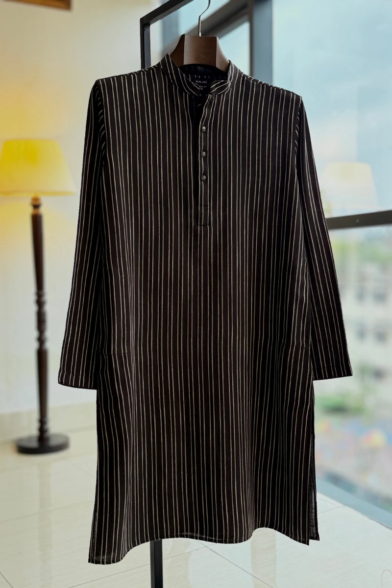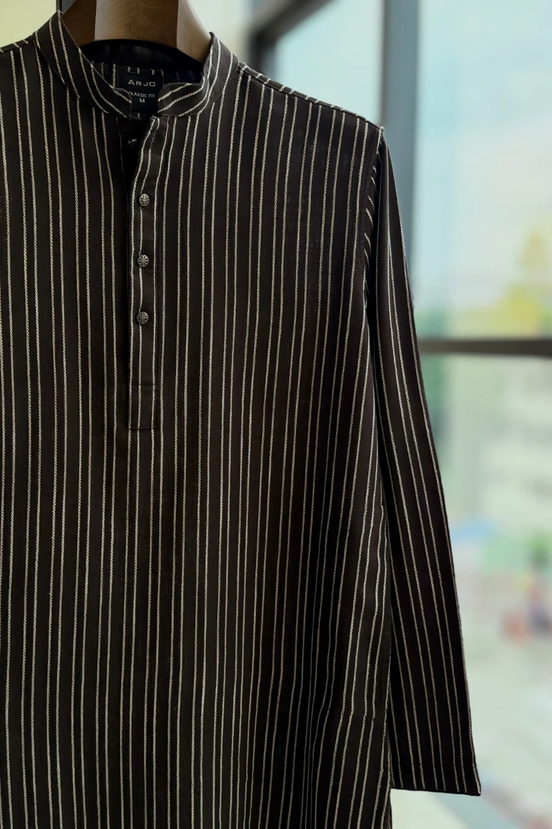 Experience timeless elegance with Arjo’s Jet Black with White Stripes Panjabi This Panjabi offers a breathable, soft feel, ensuring effortless wear throughout the day. Designed with a tailored fit, it seamlessly blends tradition with modern sophistication, making it perfect for any occasion, be it casual gatherings or festive celebrations. If you're looking for high-quality Punjabi for men in BD, this refined piece is a must-have in your collection. Elevate your style with Arjo today!