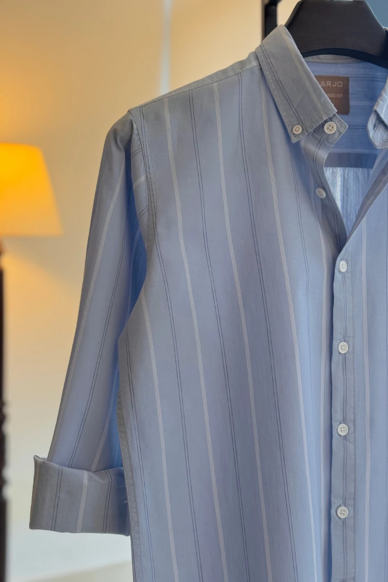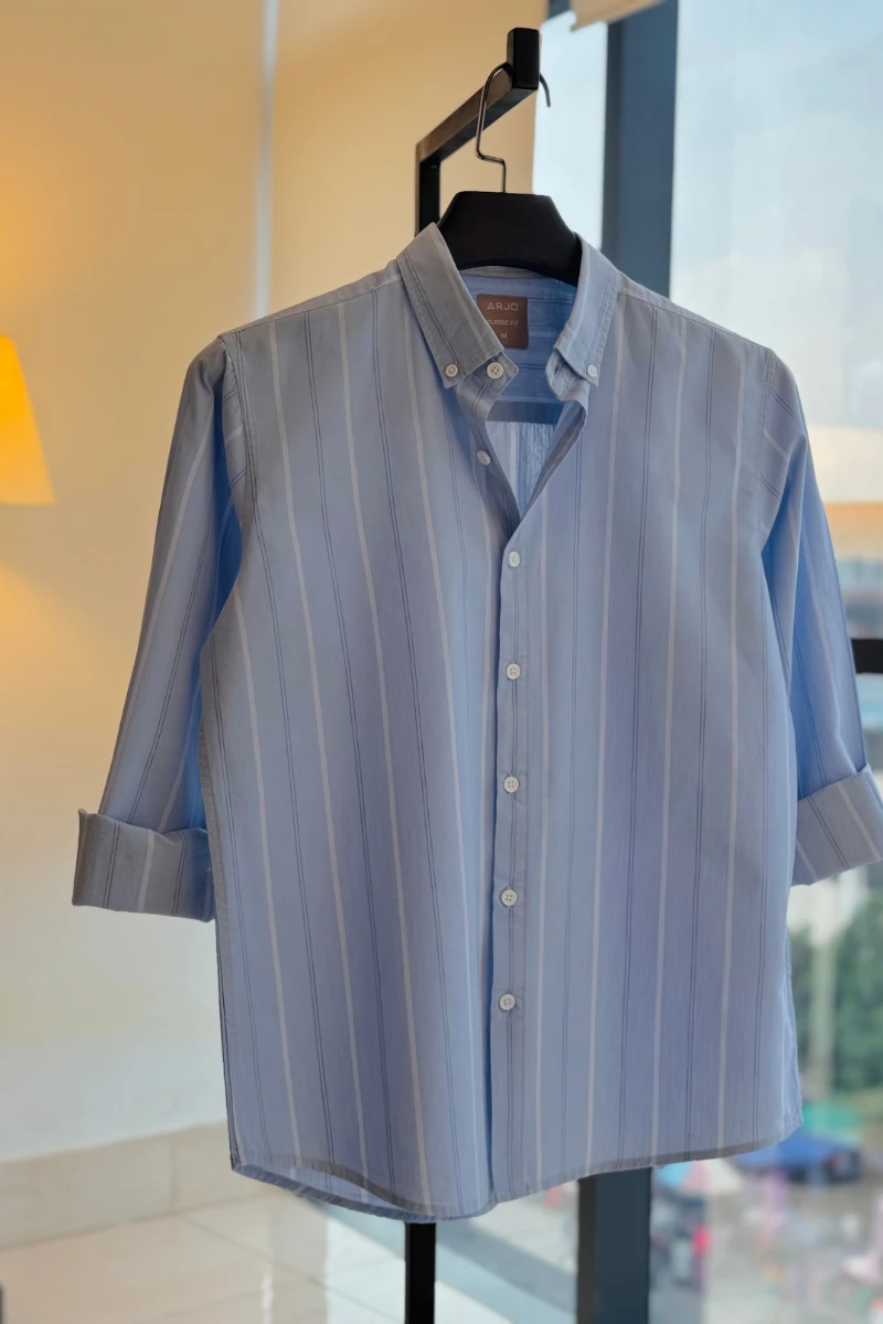 The Light Blue Vertical Stripe Button-Down Shirt – Classic Fit from Arjo is the perfect choice for effortless summer style. Crafted for comfort and breathability, this lightweight shirt keeps you cool during warmer days. With its relaxed fit and timeless stripes, it’s ideal for both casual outings and laid-back occasions. If you're looking for premium Full-sleeve shirts for men in BD, this versatile piece is a must-have. Stay stylish and comfortable all season long with Arjo.