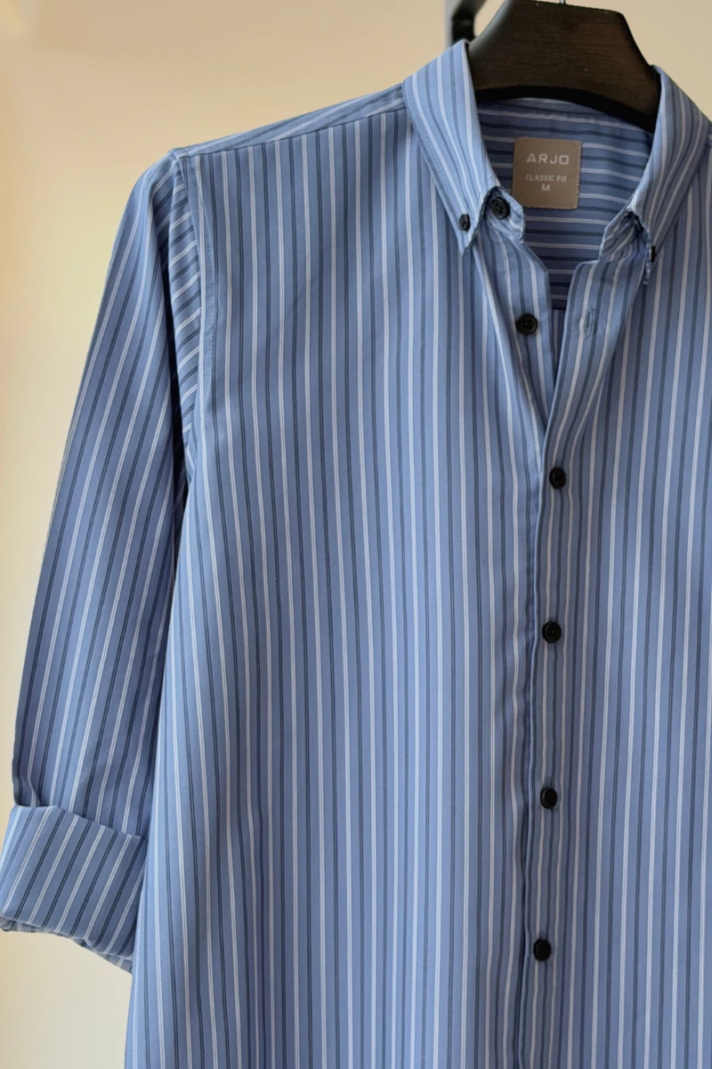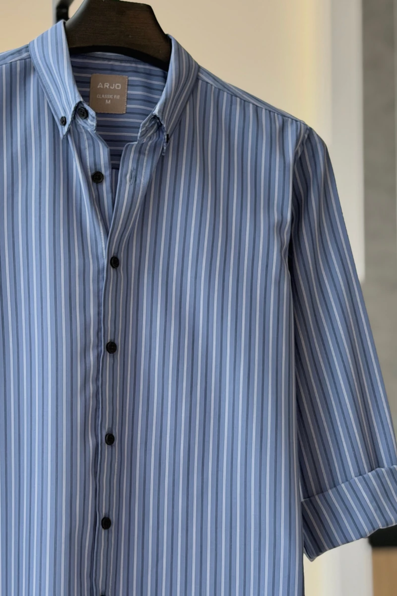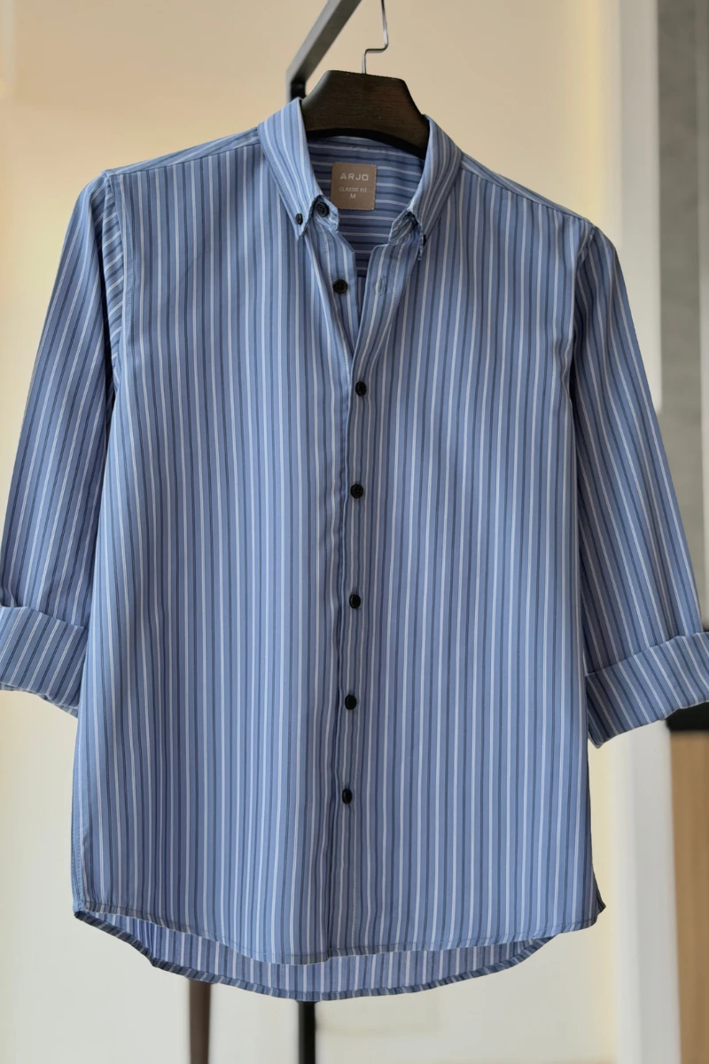 The Light Blue With Thin White And Dark Blue Vertical Stripes Shirt from Arjo is the perfect choice for effortless summer style. Crafted for comfort and breathability, this lightweight shirt keeps you cool during warmer days. With its relaxed fit and timeless stripes, it’s ideal for both casual outings and laid-back occasions. If you're looking for premium Full-sleeve shirts for men in BD, this versatile piece is a must-have. Stay stylish and comfortable all season long with Arjo.