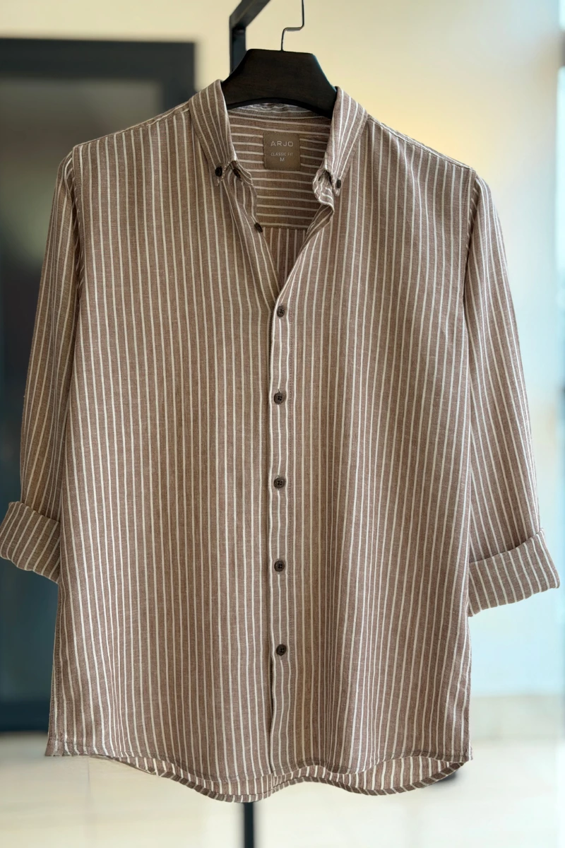 The Light brown white vertical Stripes from Arjo is the perfect choice for effortless summer style. Crafted for comfort and breathability, this lightweight shirt keeps you cool during warmer days. With its relaxed fit and timeless stripes, it’s ideal for both casual outings and laid-back occasions. If you're looking for premium Full-sleeve shirts for men in BD, this versatile piece is a must-have. Stay stylish and comfortable all season long with Arjo.