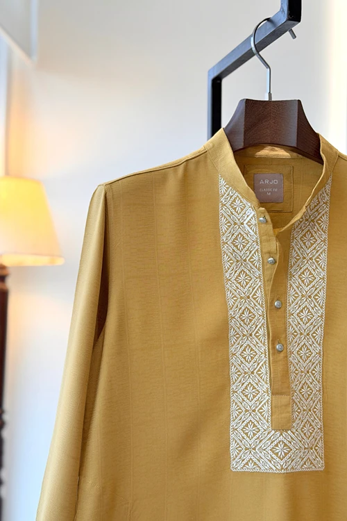 Experience timeless elegance with Light Mustard with Contrast White Embroidery Panjabi This Panjabi offers a breathable, soft feel, ensuring effortless wear throughout the day. Designed with a tailored fit, it seamlessly blends tradition with modern sophistication, making it perfect for any occasion, be it casual gatherings or festive celebrations. If you're looking for high-quality Punjabi for men in BD, this refined piece is a must-have in your collection. Elevate your style with Arjo today!
