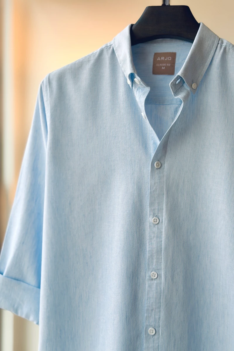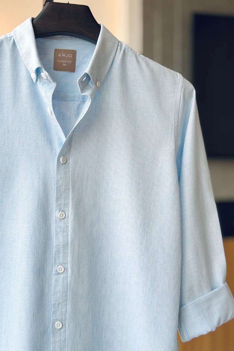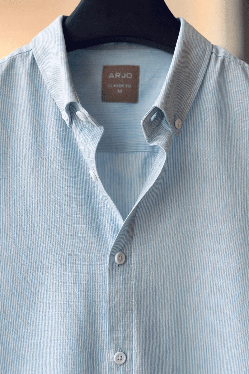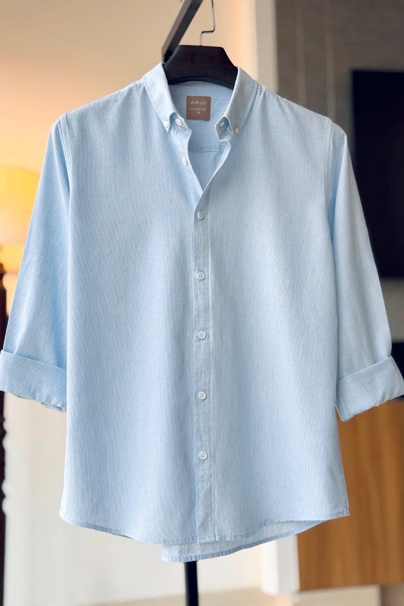 The Light Sky Blue With White Pinstripes Shirt from Arjo is the perfect choice for effortless summer style. Crafted for comfort and breathability, this lightweight shirt keeps you cool during warmer days. With its relaxed fit and timeless stripes, it’s ideal for both casual outings and laid-back occasions. If you're looking for premium Full-sleeve shirts for men in BD, this versatile piece is a must-have. Stay stylish and comfortable all season long with Arjo.
