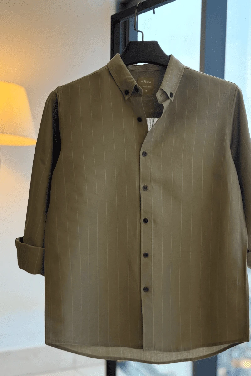 The Muted Olive Green Base With Subtle Thin Vertical Pinstripes Shirt from Arjo is the perfect choice for effortless summer style. Crafted for comfort and breathability, this lightweight shirt keeps you cool during warmer days. With its relaxed fit and timeless stripes, it’s ideal for both casual outings and laid-back occasions. If you're looking for premium Full-sleeve shirts for men in BD, this versatile piece is a must-have. Stay stylish and comfortable all season long with Arjo.