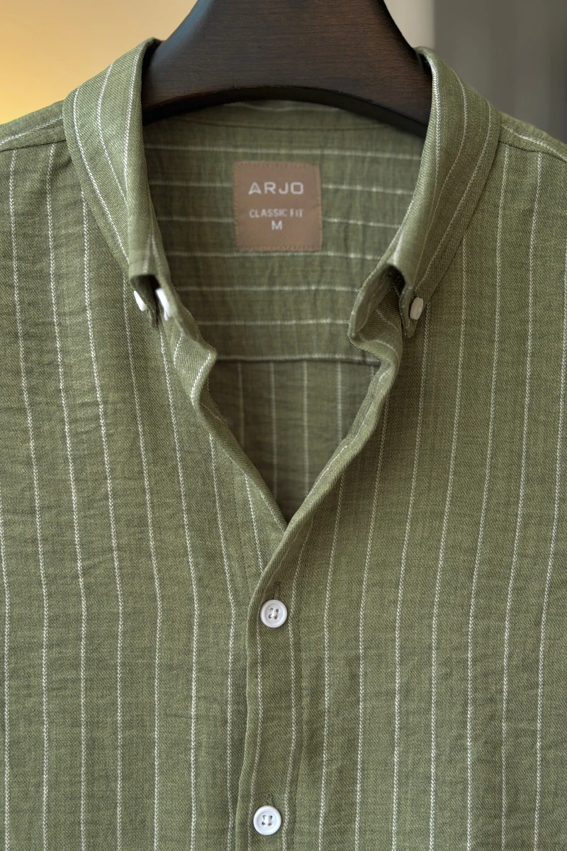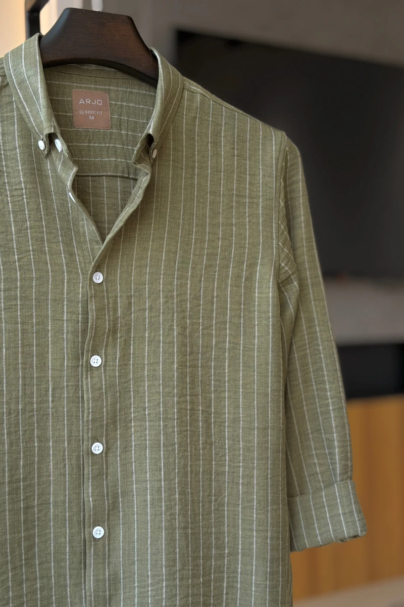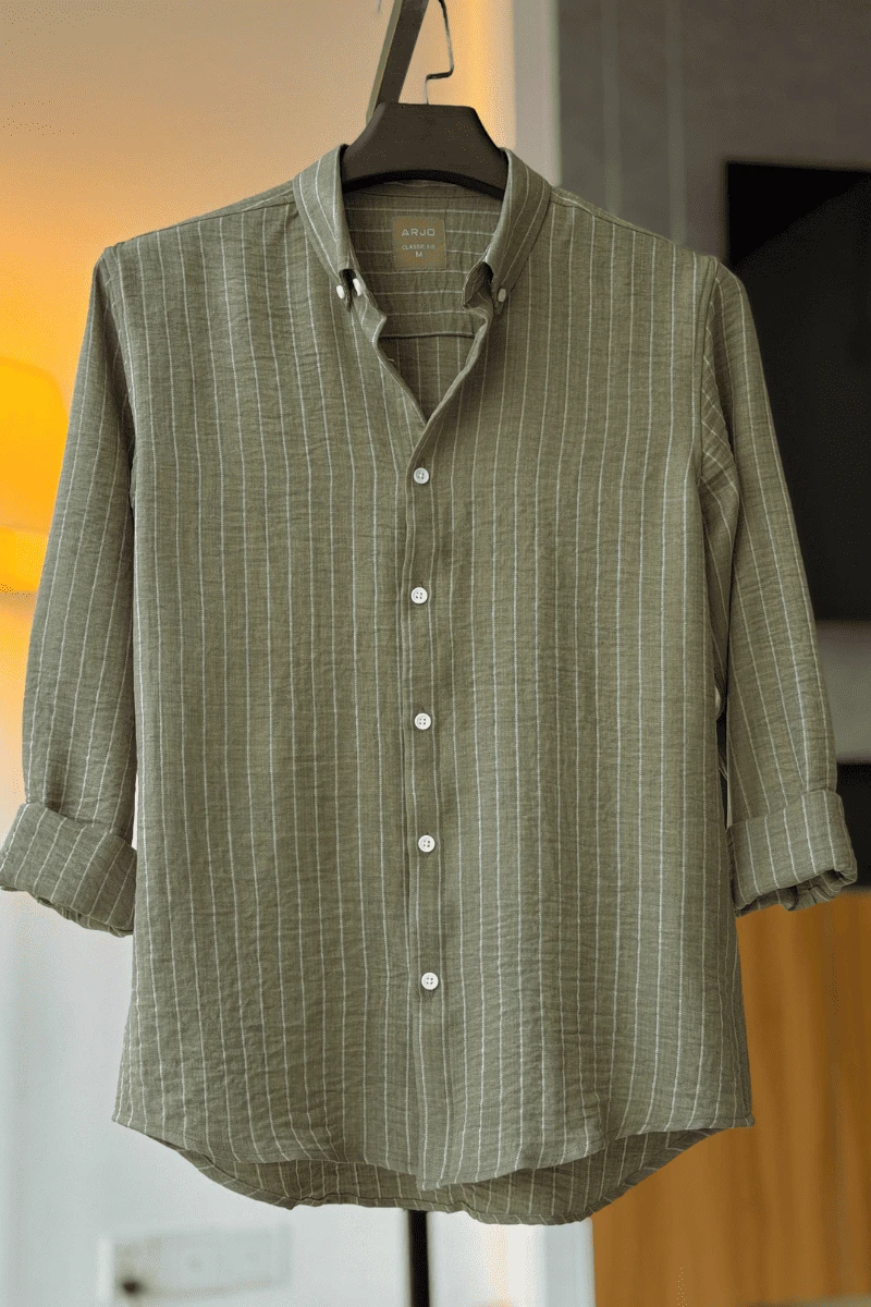The Muted Olive Green With White Stripes Shirt from Arjo is the perfect choice for effortless summer style. Crafted for comfort and breathability, this lightweight shirt keeps you cool during warmer days. With its relaxed fit and timeless stripes, it’s ideal for both casual outings and laid-back occasions. If you're looking for premium Full-sleeve shirts for men in BD, this versatile piece is a must-have. Stay stylish and comfortable all season long with Arjo.