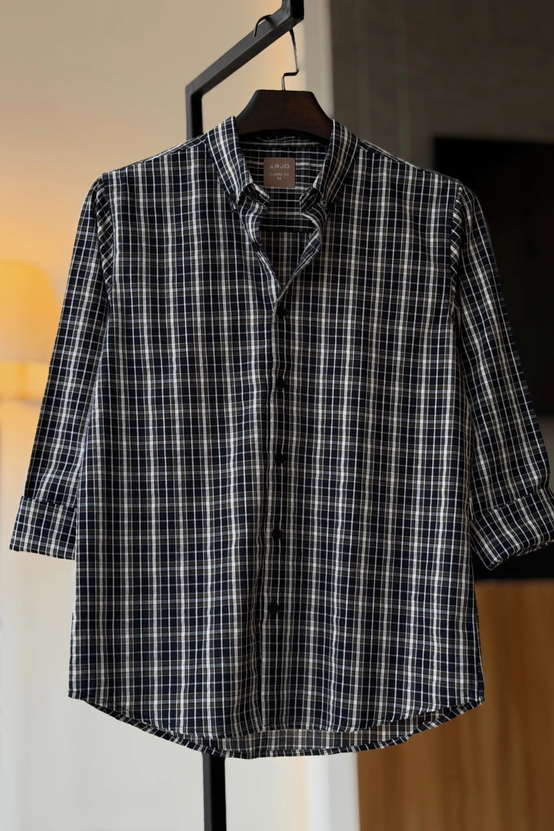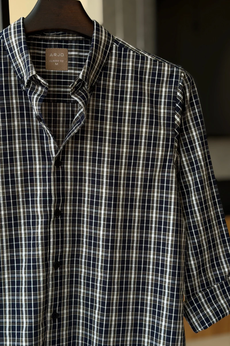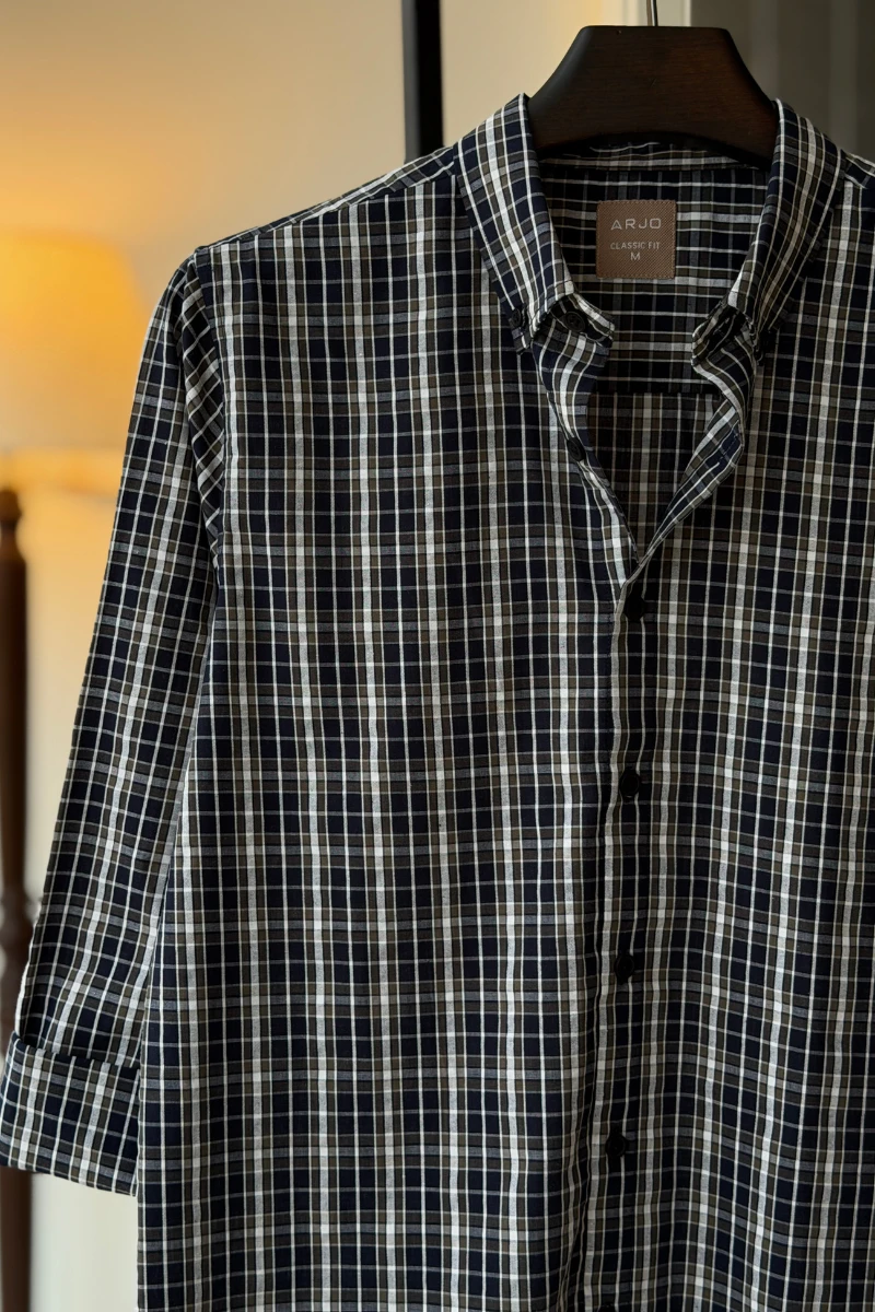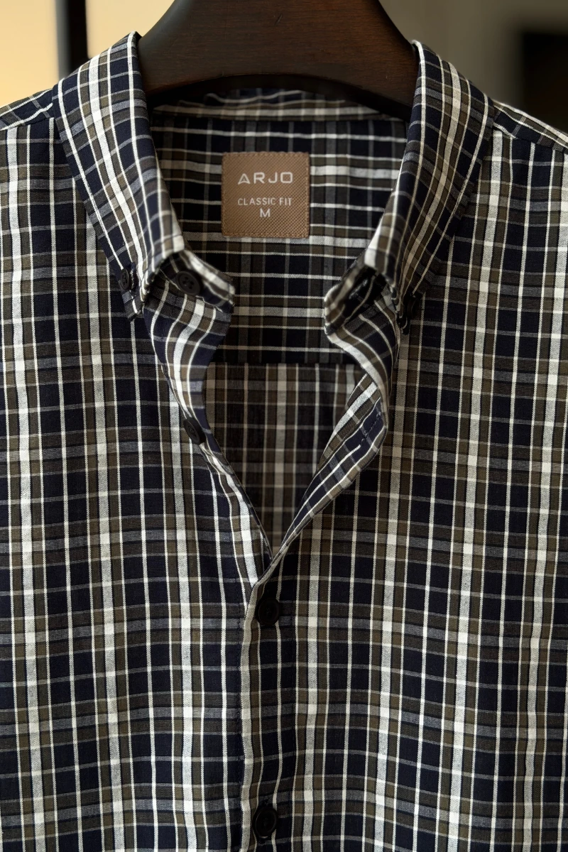 The Navy Blue With Olive And White Checked Shirt from Arjo is the perfect choice for effortless summer style. Crafted for comfort and breathability, this lightweight shirt keeps you cool during warmer days. With its relaxed fit and timeless stripes, it’s ideal for both casual outings and laid-back occasions. If you're looking for premium Full-sleeve shirts for men in BD, this versatile piece is a must-have. Stay stylish and comfortable all season long with Arjo.