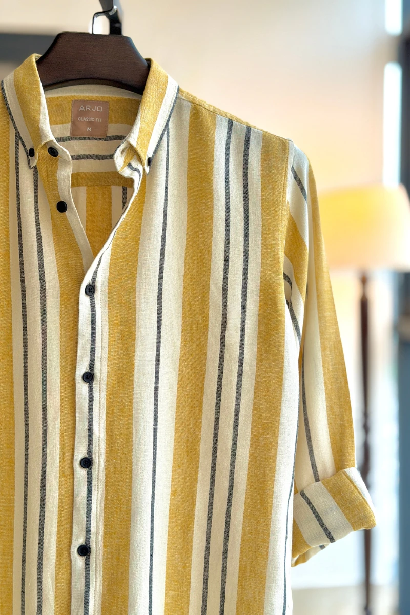 The Off White Base with Saffron Yellow & Black Stripes Shirt from Arjo is the perfect choice for effortless summer style. Crafted for comfort and breathability, this lightweight shirt keeps you cool during warmer days. With its relaxed fit and timeless stripes, it’s ideal for both casual outings and laid-back occasions. If you're looking for premium Full-sleeve shirts for men in BD, this versatile piece is a must-have. Stay stylish and comfortable all season long with Arjo.