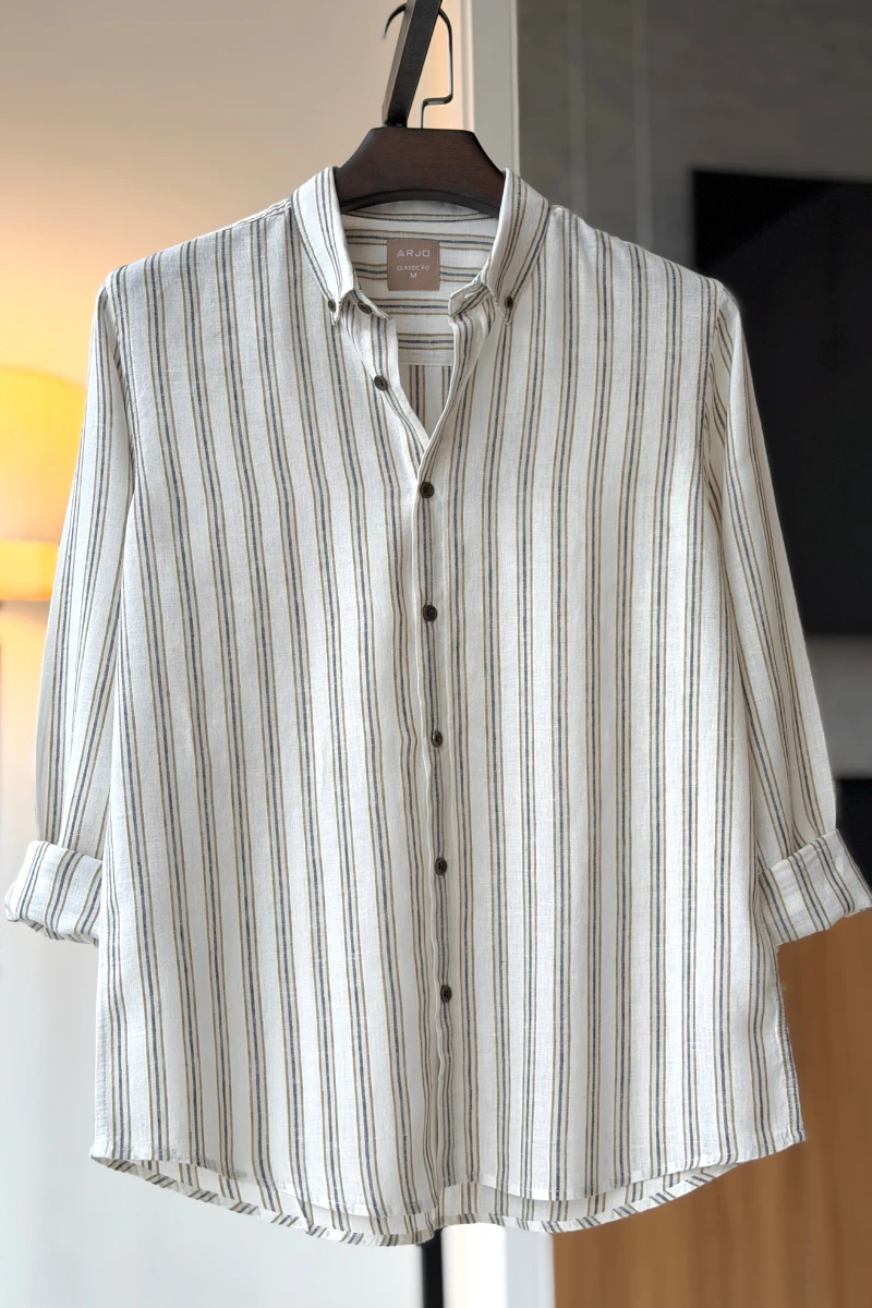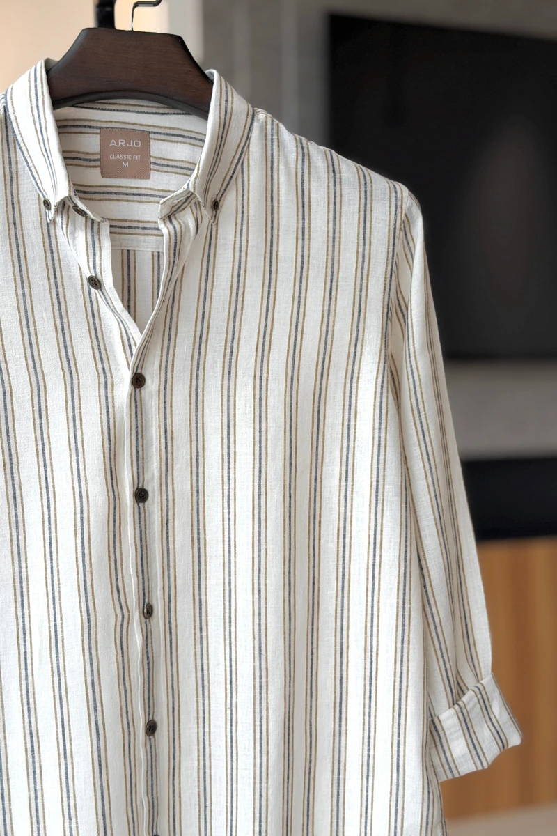 The Off-White With Beige And Blue Stripes Shirt from Arjo is the perfect choice for effortless summer style. Crafted for comfort and breathability, this lightweight shirt keeps you cool during warmer days. With its relaxed fit and timeless stripes, it’s ideal for both casual outings and laid-back occasions. If you're looking for premium Full-sleeve shirts for men in BD, this versatile piece is a must-have. Stay stylish and comfortable all season long with Arjo.