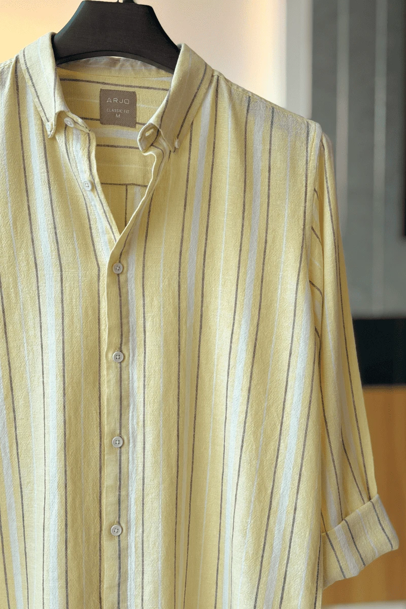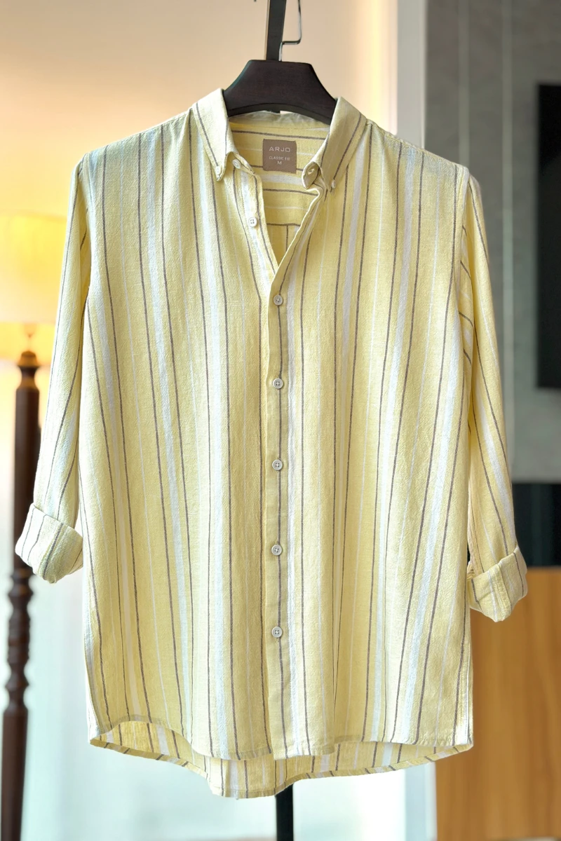 The Pale Yellow With Grey And White Stripes Shirt from Arjo is the perfect choice for effortless summer style. Crafted for comfort and breathability, this lightweight shirt keeps you cool during warmer days. With its relaxed fit and timeless stripes, it’s ideal for both casual outings and laid-back occasions. If you're looking for premium Full-sleeve shirts for men in BD, this versatile piece is a must-have. Stay stylish and comfortable all season long with Arjo.