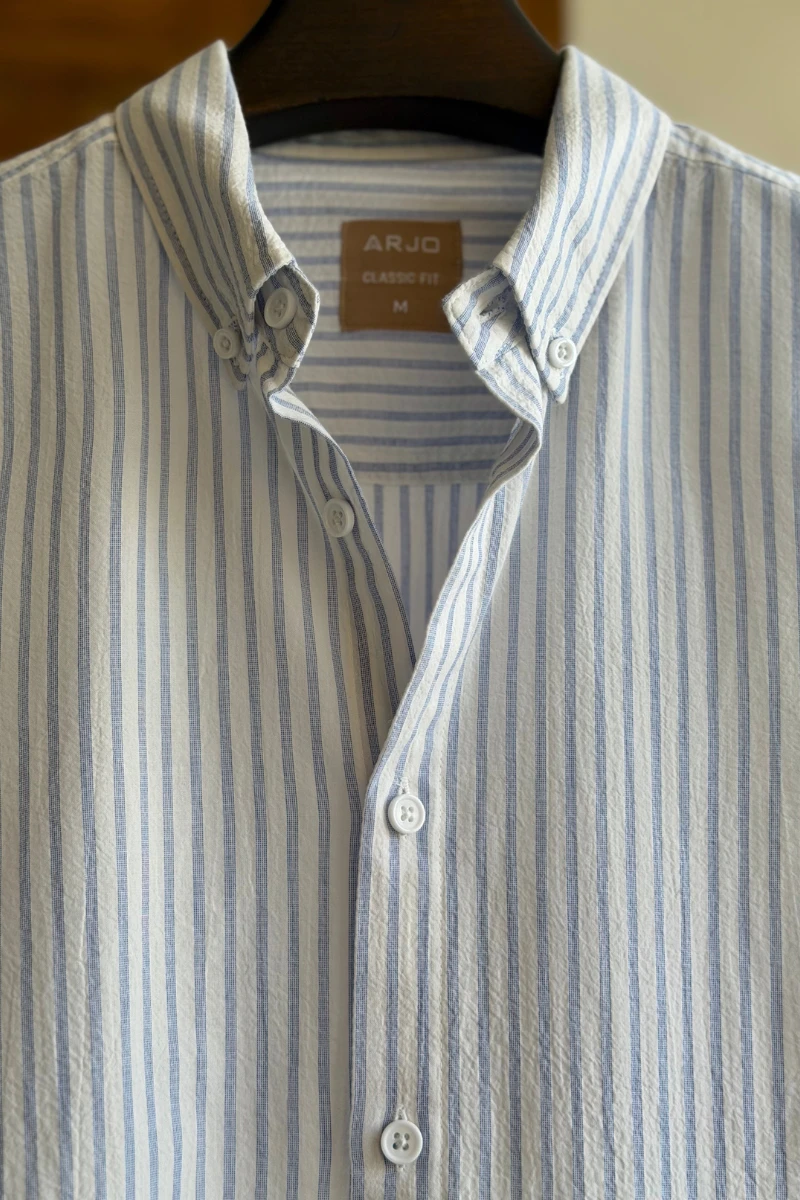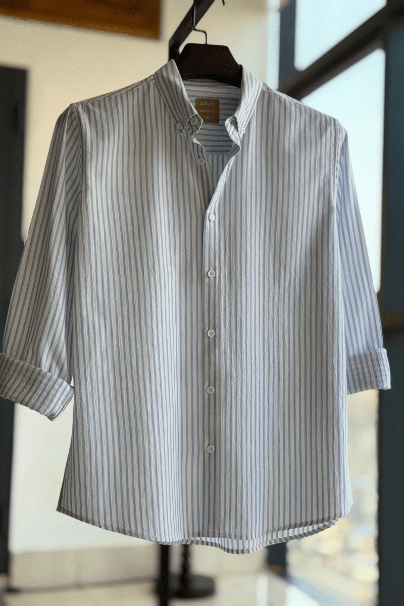 The Powder Blue With White Stripes Shirt from Arjo is the perfect choice for effortless summer style. Crafted for comfort and breathability, this lightweight shirt keeps you cool during warmer days. With its relaxed fit and timeless stripes, it’s ideal for both casual outings and laid-back occasions. If you're looking for premium Full-sleeve shirts for men in BD, this versatile piece is a must-have. Stay stylish and comfortable all season long with Arjo.