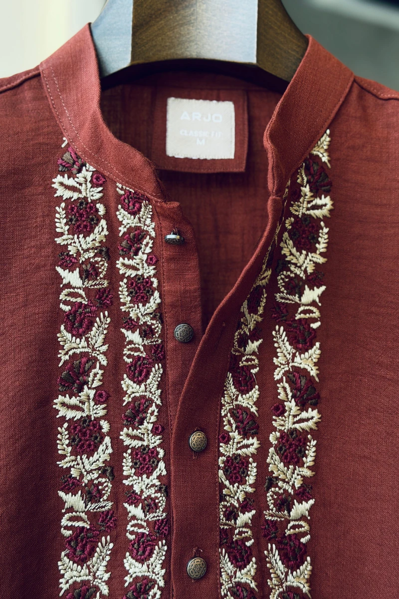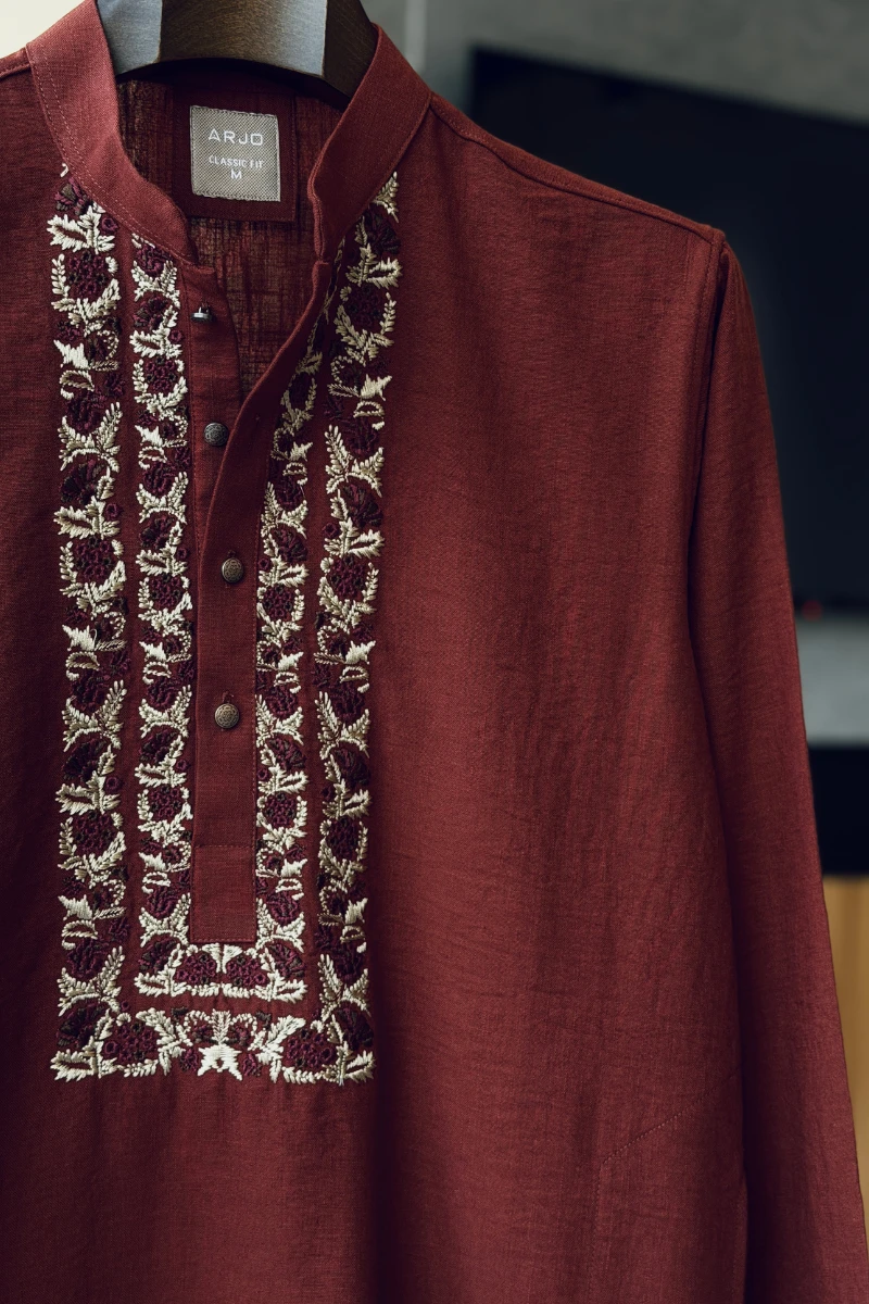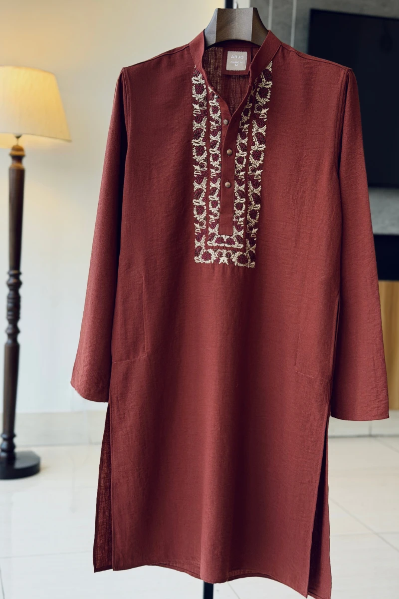 Experience timeless elegance with Arjo’s Rust with Contrast Embroidered Panjabi This Panjabi offers a breathable, soft feel, ensuring effortless wear throughout the day. Designed with a tailored fit, it seamlessly blends tradition with modern sophistication, making it perfect for any occasion, be it casual gatherings or festive celebrations. If you're looking for high-quality Punjabi for men in BD, this refined piece is a must-have in your collection. Elevate your style with Arjo today!