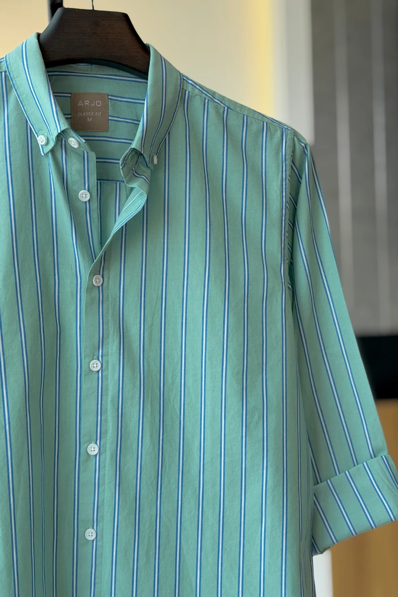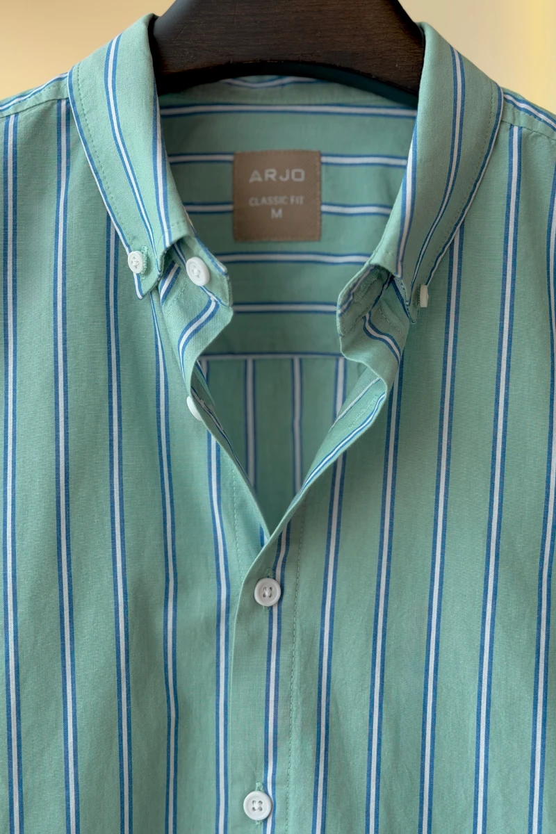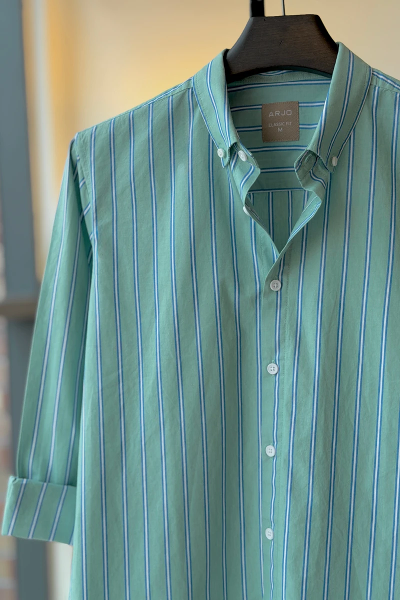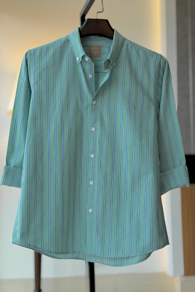 The Sage Green With Blue And White Stripes Shirt from Arjo is the perfect choice for effortless summer style. Crafted for comfort and breathability, this lightweight shirt keeps you cool during warmer days. With its relaxed fit and timeless stripes, it’s ideal for both casual outings and laid-back occasions. If you're looking for premium Full-sleeve shirts for men in BD, this versatile piece is a must-have. Stay stylish and comfortable all season long with Arjo.