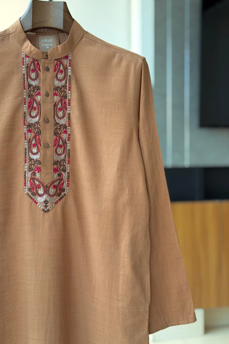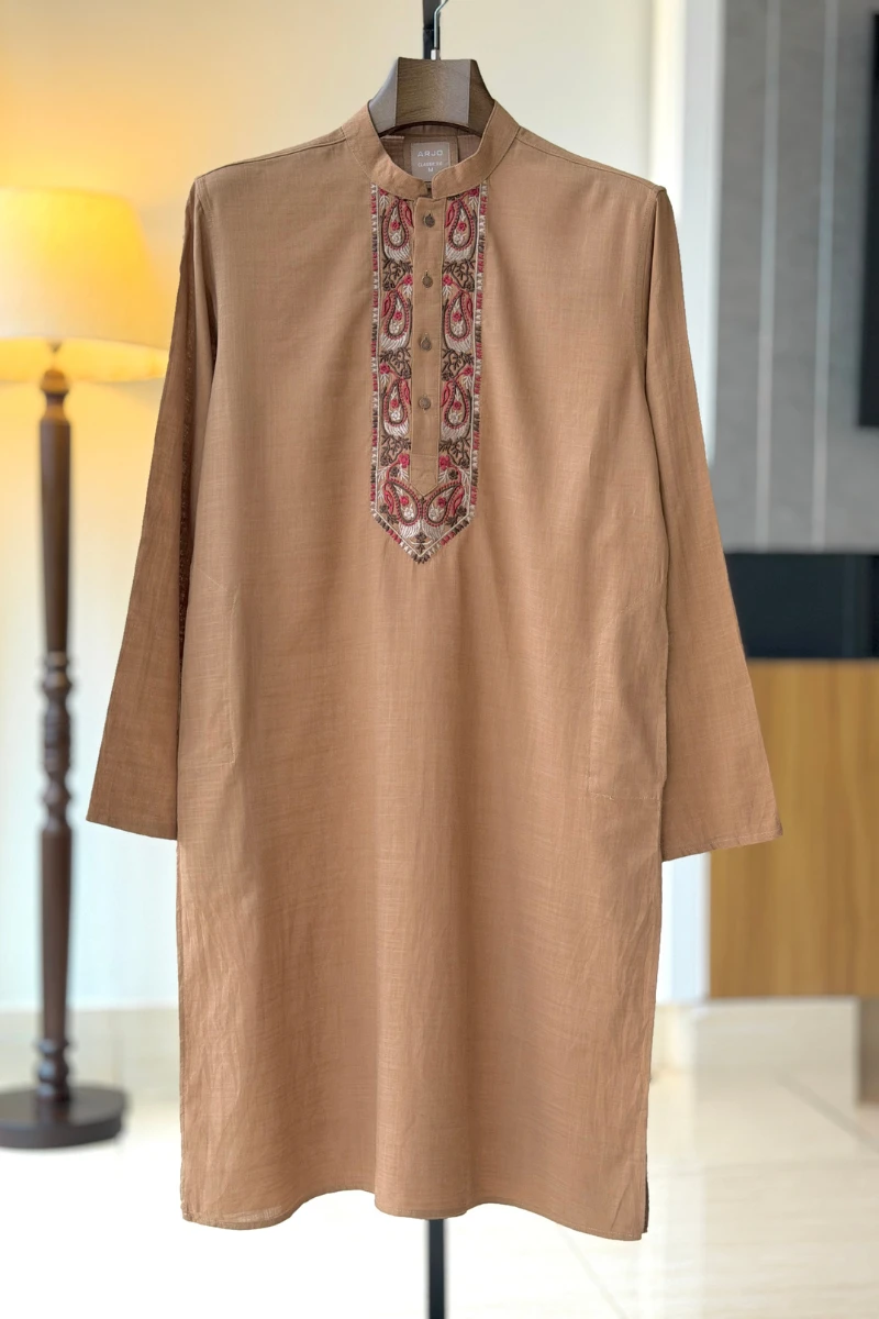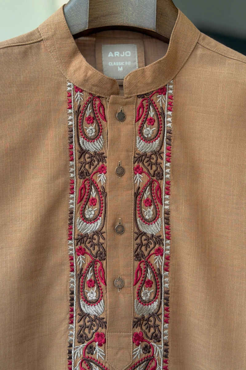 Experience timeless elegance with Arjo’s Sand Brown Embroidered Panjabi This Panjabi offers a breathable, soft feel, ensuring effortless wear throughout the day. Designed with a tailored fit, it seamlessly blends tradition with modern sophistication, making it perfect for any occasion, be it casual gatherings or festive celebrations. If you're looking for high-quality Punjabi for men in BD, this refined piece is a must-have in your collection. Elevate your style with Arjo today!