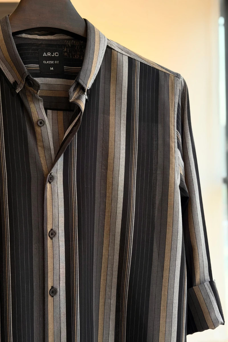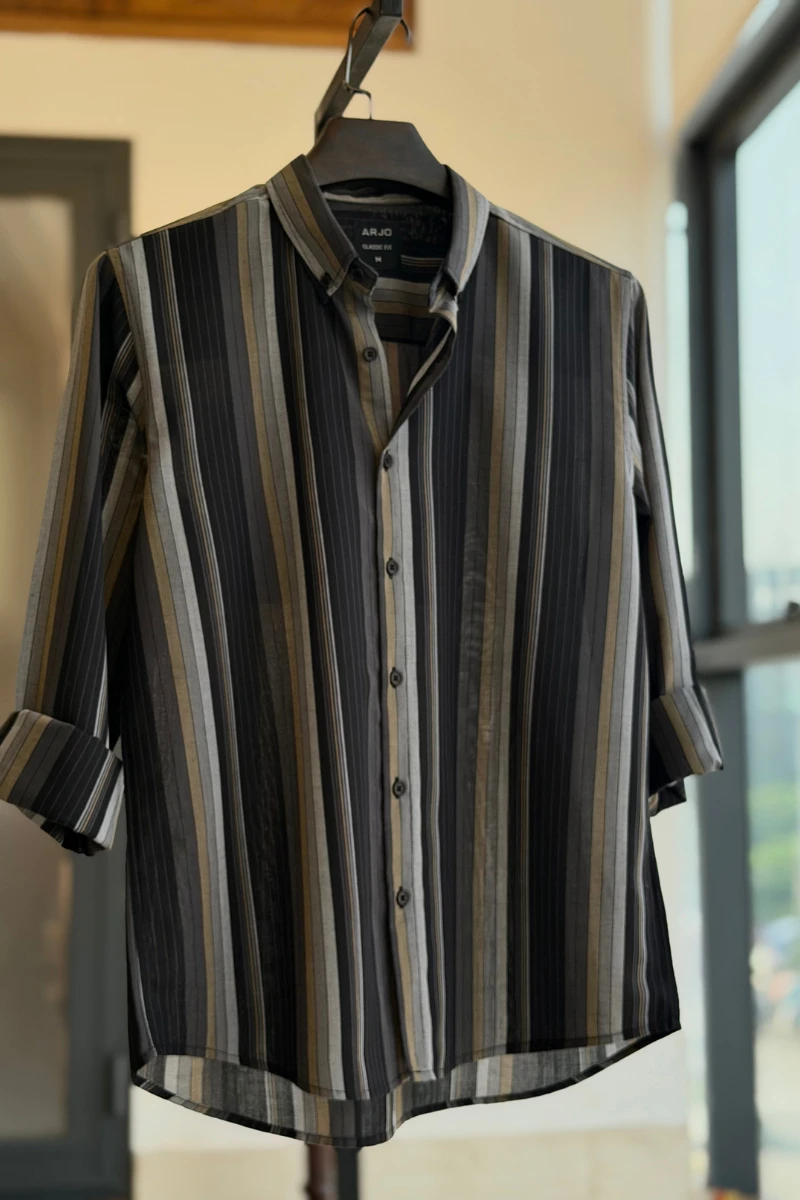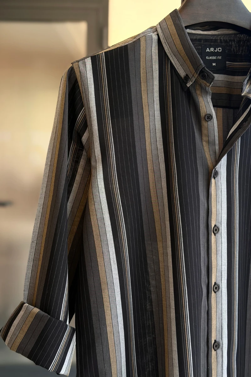 The Sleek Mix of Black, Ash Grey & Muted Gold Vertical Stripes Shirt from Arjo is the perfect choice for effortless summer style. Crafted for comfort and breathability, this lightweight shirt keeps you cool during warmer days. With its relaxed fit and timeless stripes, it’s ideal for both casual outings and laid-back occasions. If you're looking for premium Full-sleeve shirts for men in BD, this versatile piece is a must-have. Stay stylish and comfortable all season long with Arjo.