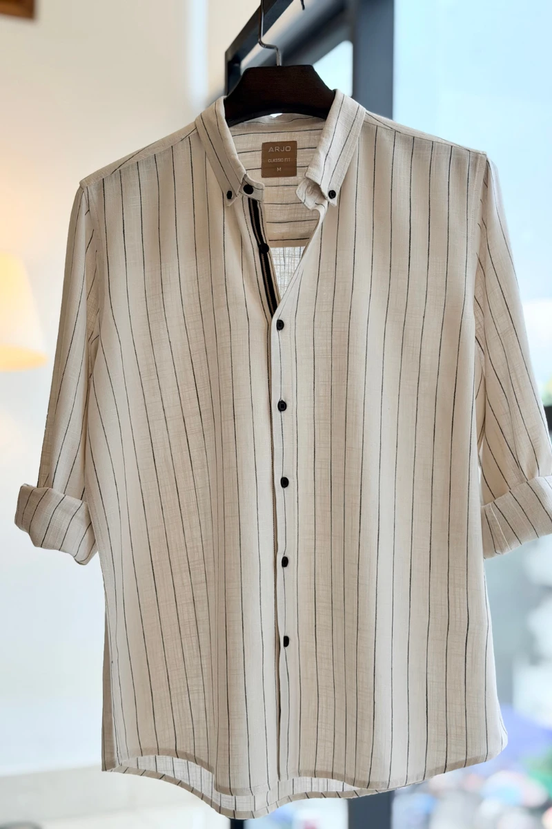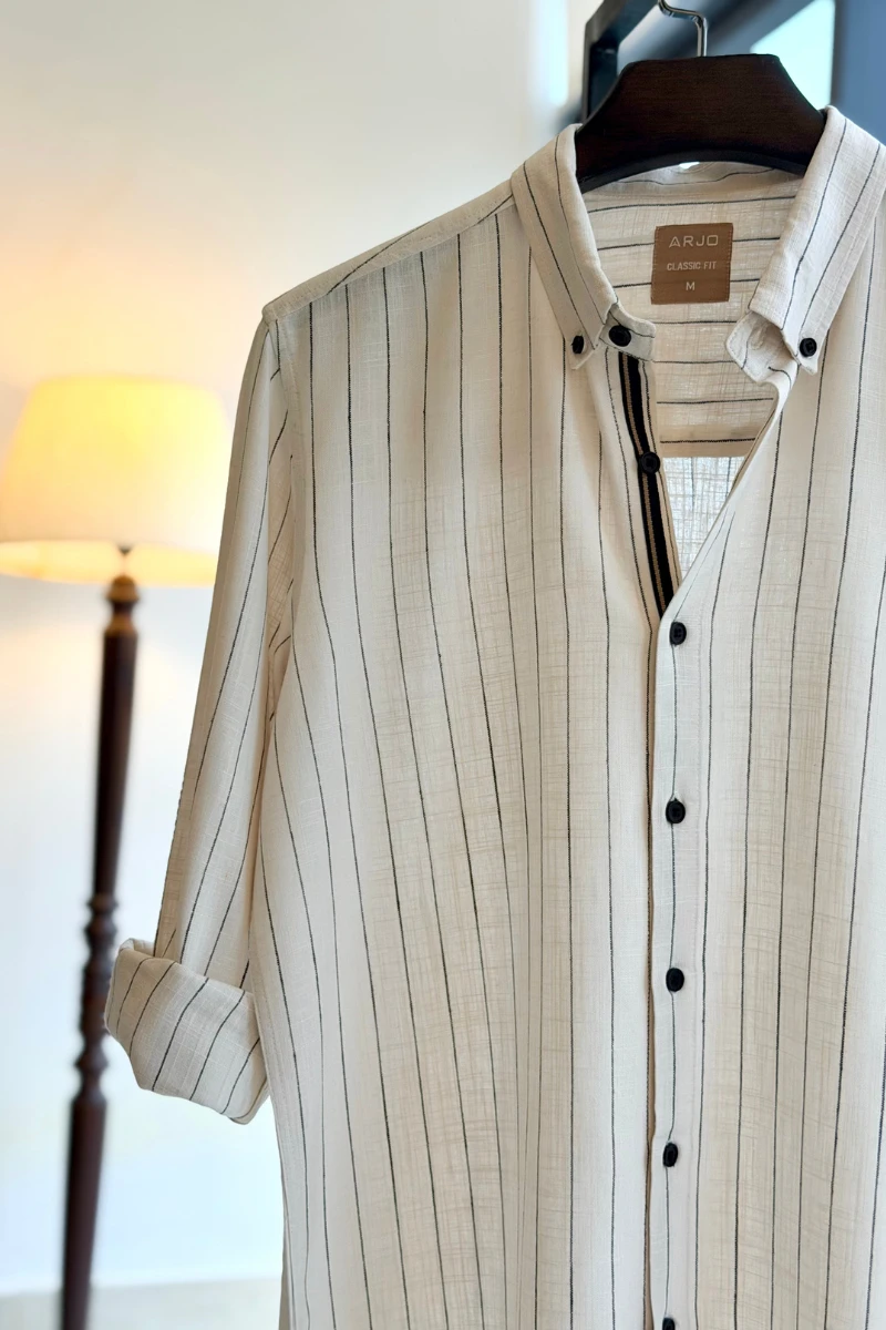 The Soft Ivory Shirt With Navy Stripes from Arjo is the perfect choice for effortless summer style. Crafted for comfort and breathability, this lightweight shirt keeps you cool during warmer days. With its relaxed fit and timeless stripes, it’s ideal for both casual outings and laid-back occasions. If you're looking for premium Full-sleeve shirts for men in BD, this versatile piece is a must-have. Stay stylish and comfortable all season long with Arjo.