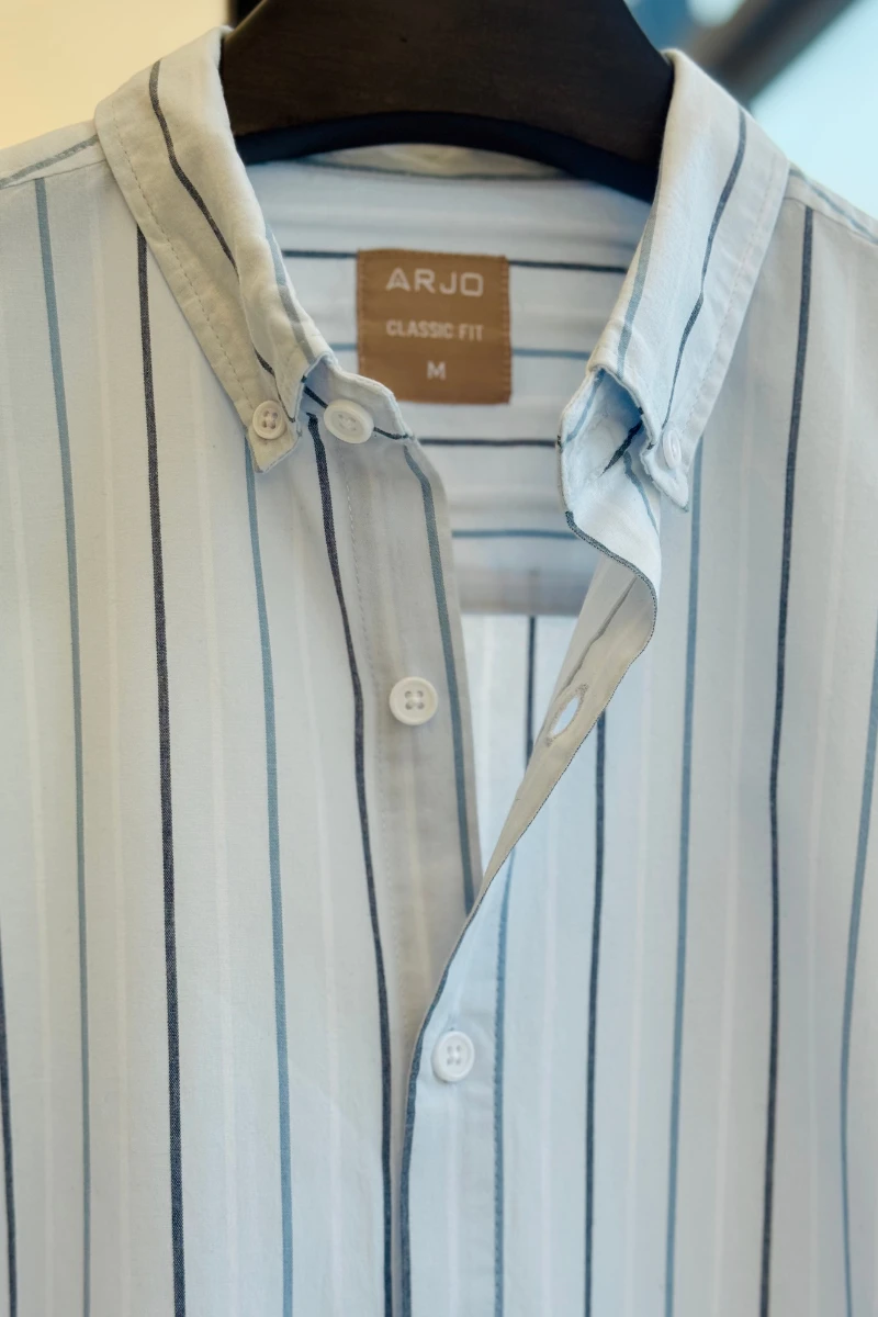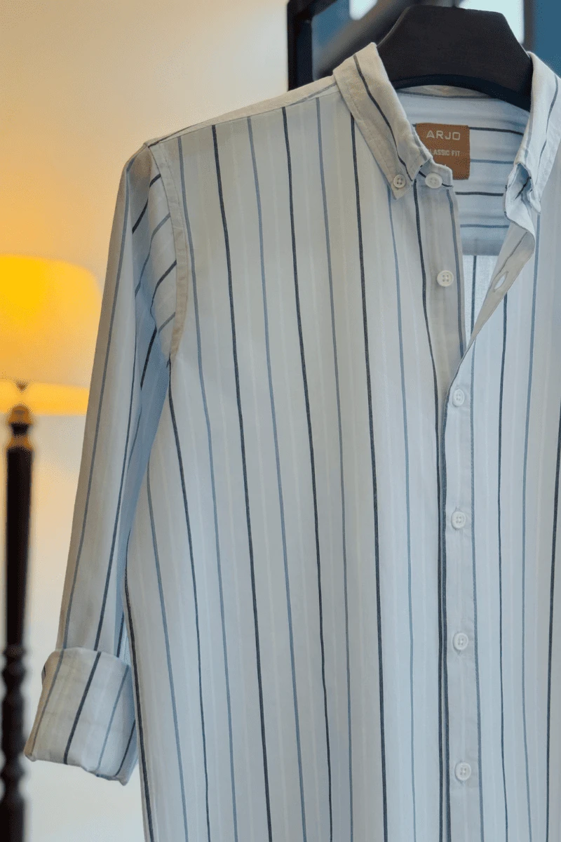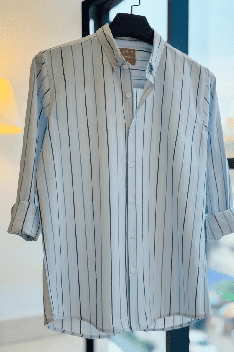 The Soft Sky Blue Base With Alternating Thin Navy And Light Blue Vertical Stripes Shirt from Arjo is the perfect choice for effortless summer style. Crafted for comfort and breathability, this lightweight shirt keeps you cool during warmer days. With its relaxed fit and timeless stripes, it’s ideal for both casual outings and laid-back occasions. If you're looking for premium Full-sleeve shirts for men in BD, this versatile piece is a must-have. Stay stylish and comfortable all season long with Arjo.