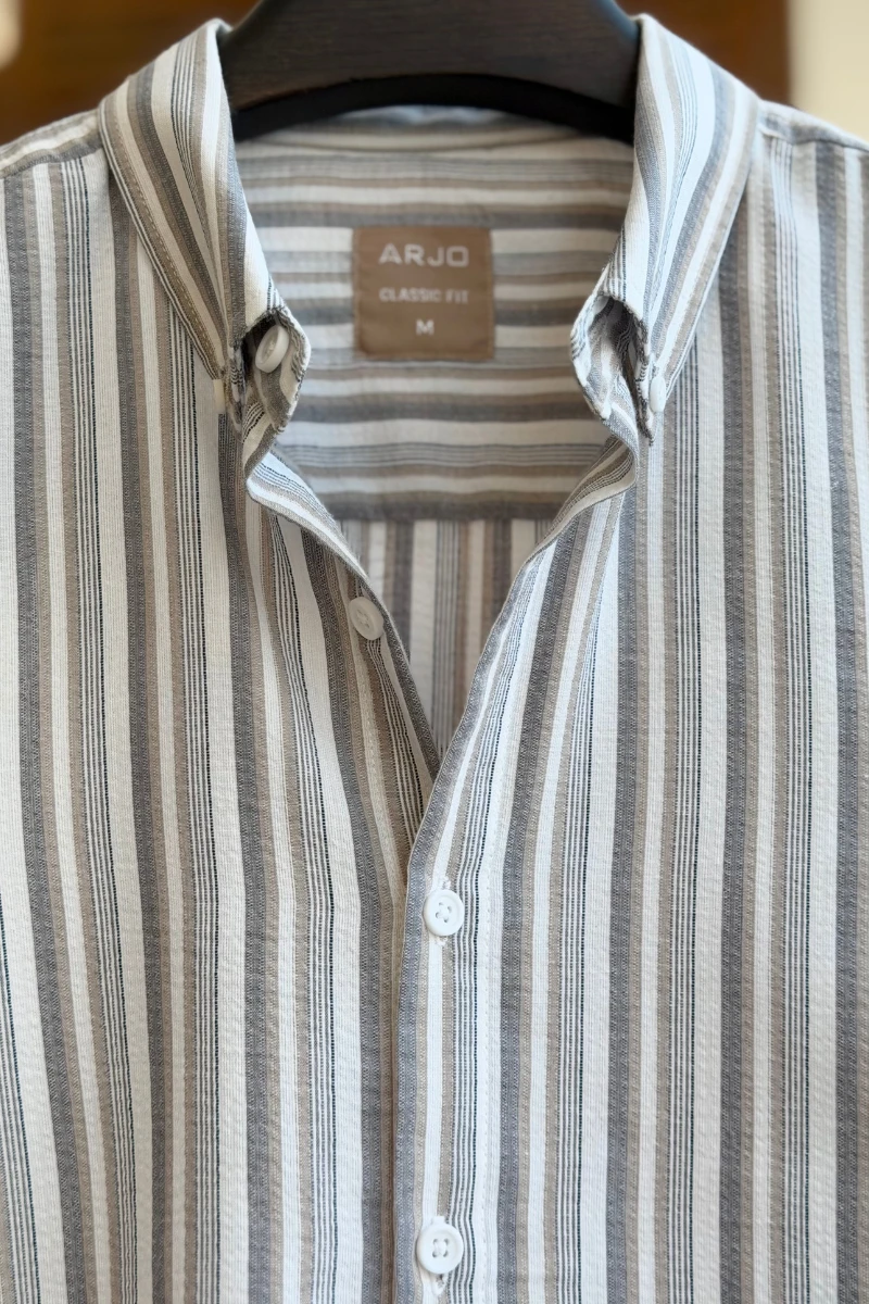 The Stone Grey & Off-White Striped from Arjo is the perfect choice for effortless summer style. Crafted for comfort and breathability, this lightweight shirt keeps you cool during warmer days. With its relaxed fit and timeless stripes, it’s ideal for both casual outings and laid-back occasions. If you're looking for premium Full-sleeve shirts for men in BD, this versatile piece is a must-have. Stay stylish and comfortable all season long with Arjo.