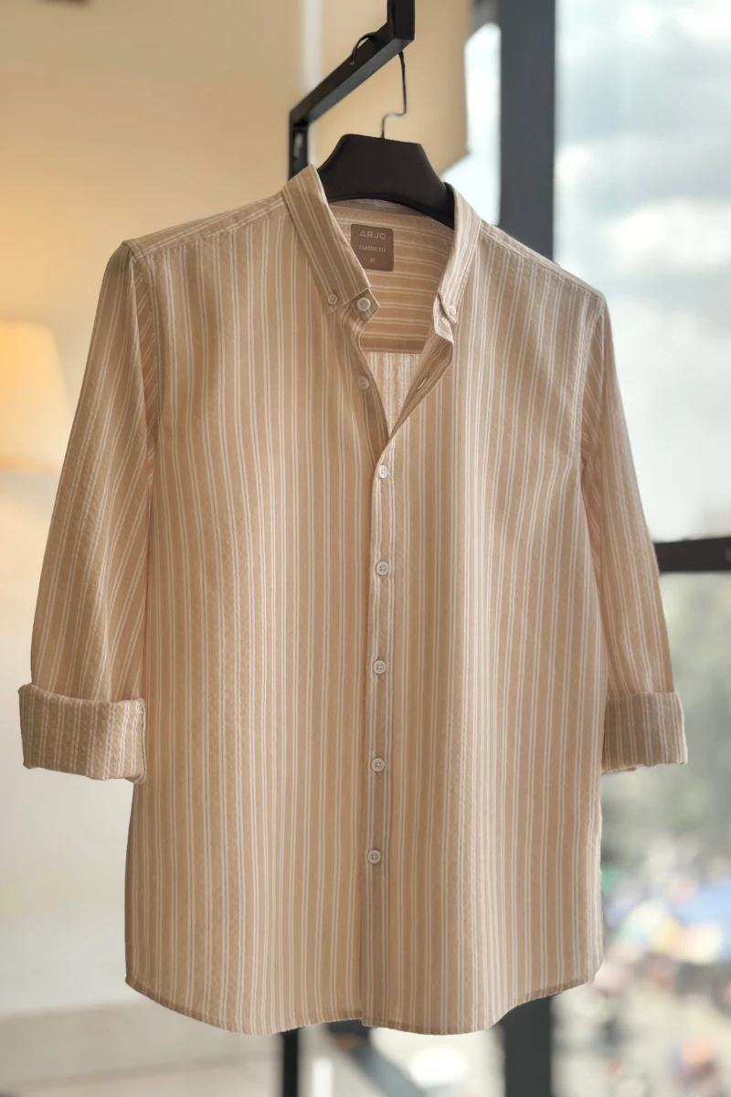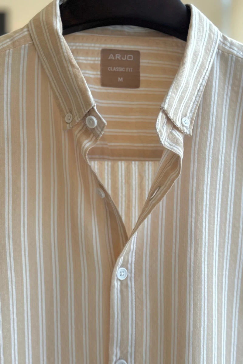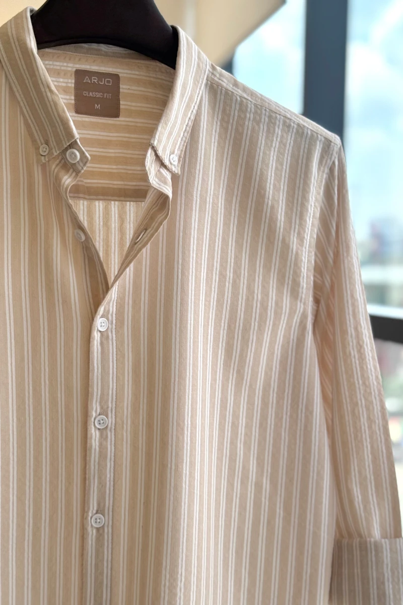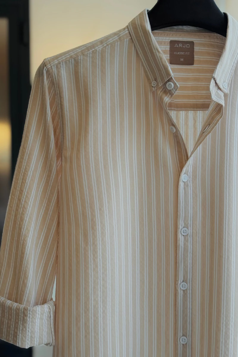 The Striped Button Down Shirt Medium Beige & White Stripes from Arjo is the perfect choice for effortless summer style. Crafted for comfort and breathability, this lightweight shirt keeps you cool during warmer days. With its relaxed fit and timeless stripes, it’s ideal for both casual outings and laid-back occasions. If you're looking for premium Full-sleeve shirts for men in BD, this versatile piece is a must-have. Stay stylish and comfortable all season long with Arjo.