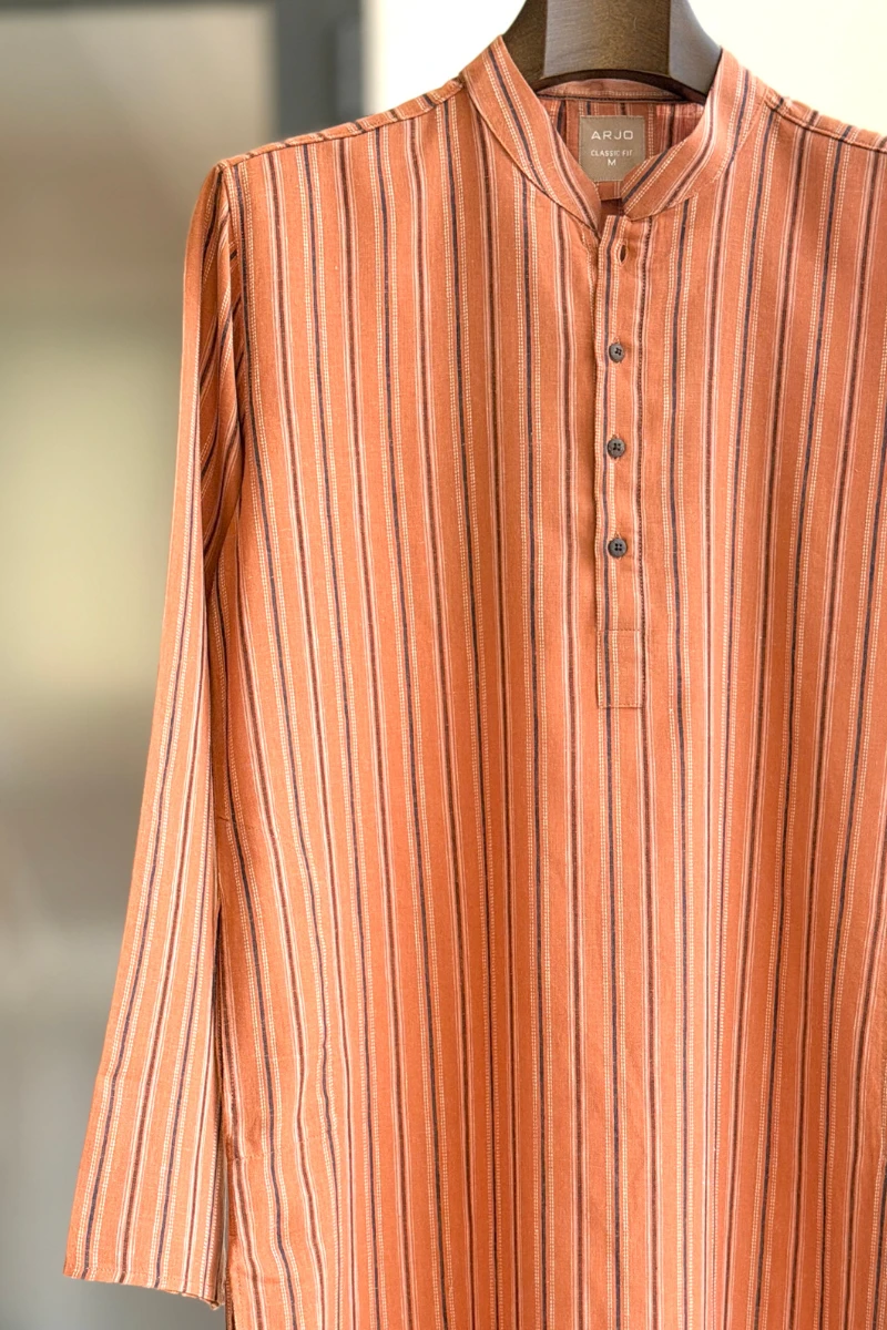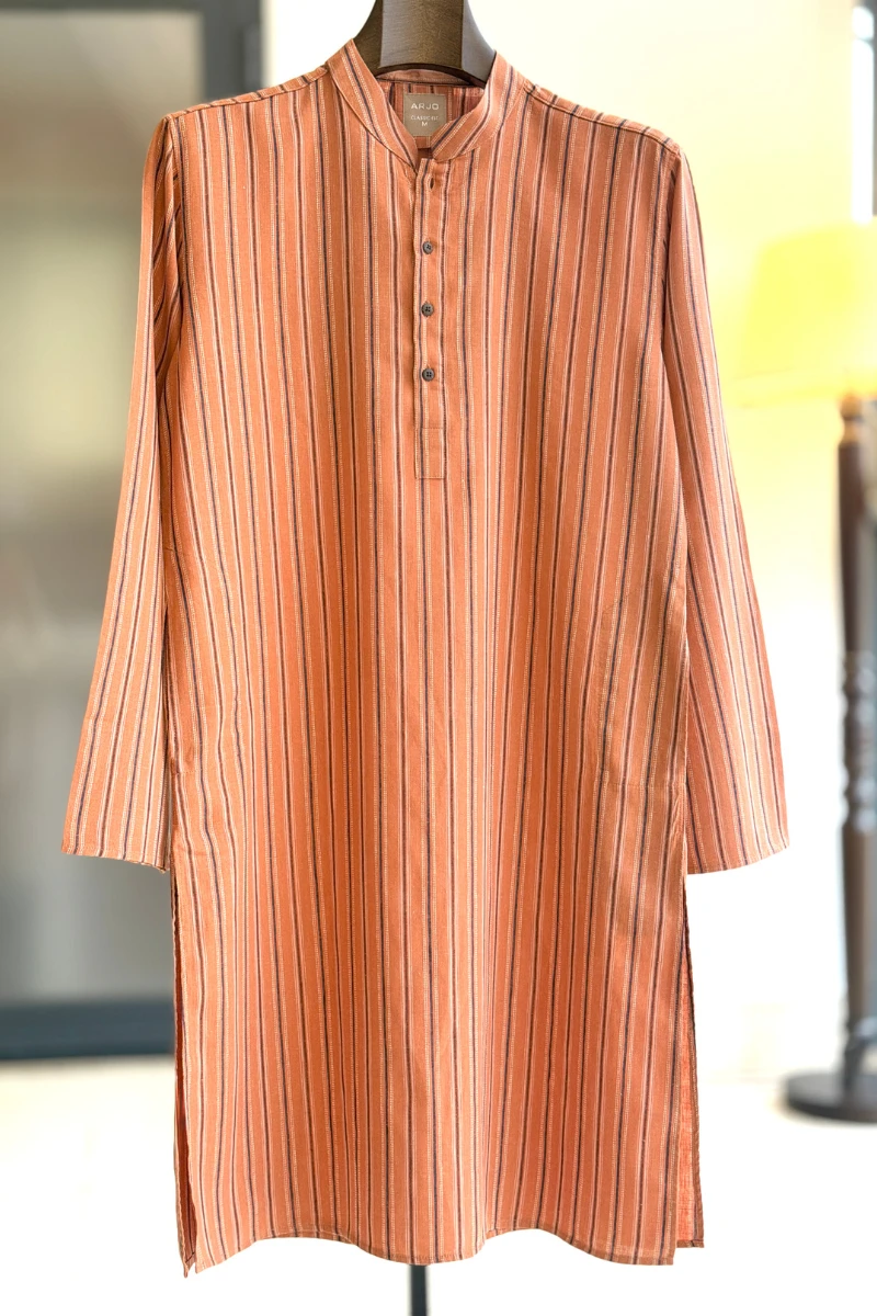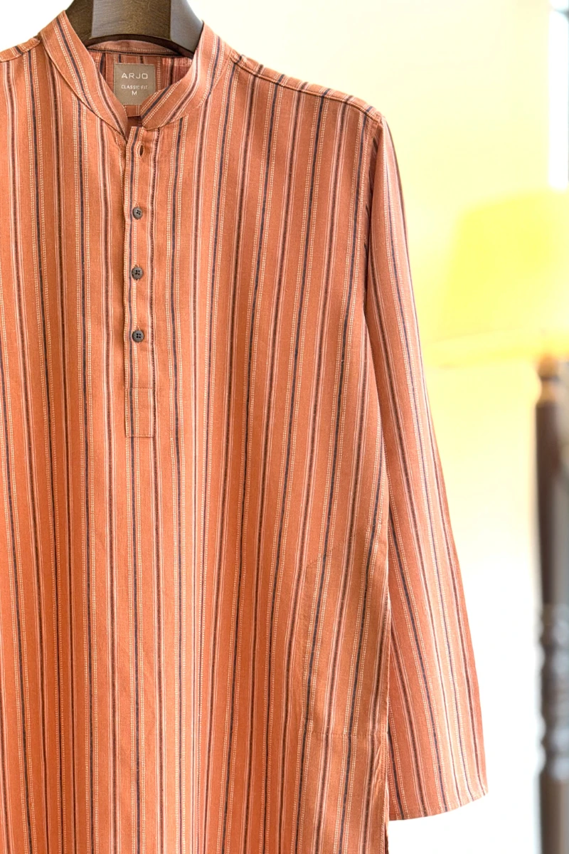 Experience timeless elegance with Arjo’s Tangerine with Multi Color Stripe Panjabi This Panjabi offers a breathable, soft feel, ensuring effortless wear throughout the day. Designed with a tailored fit, it seamlessly blends tradition with modern sophistication, making it perfect for any occasion, be it casual gatherings or festive celebrations. If you're looking for high-quality Punjabi for men in BD, this refined piece is a must-have in your collection. Elevate your style with Arjo today!