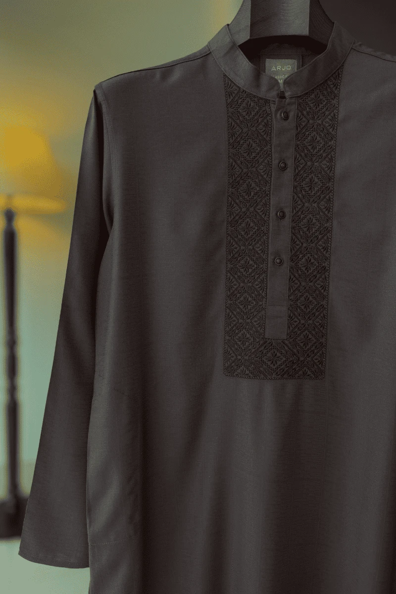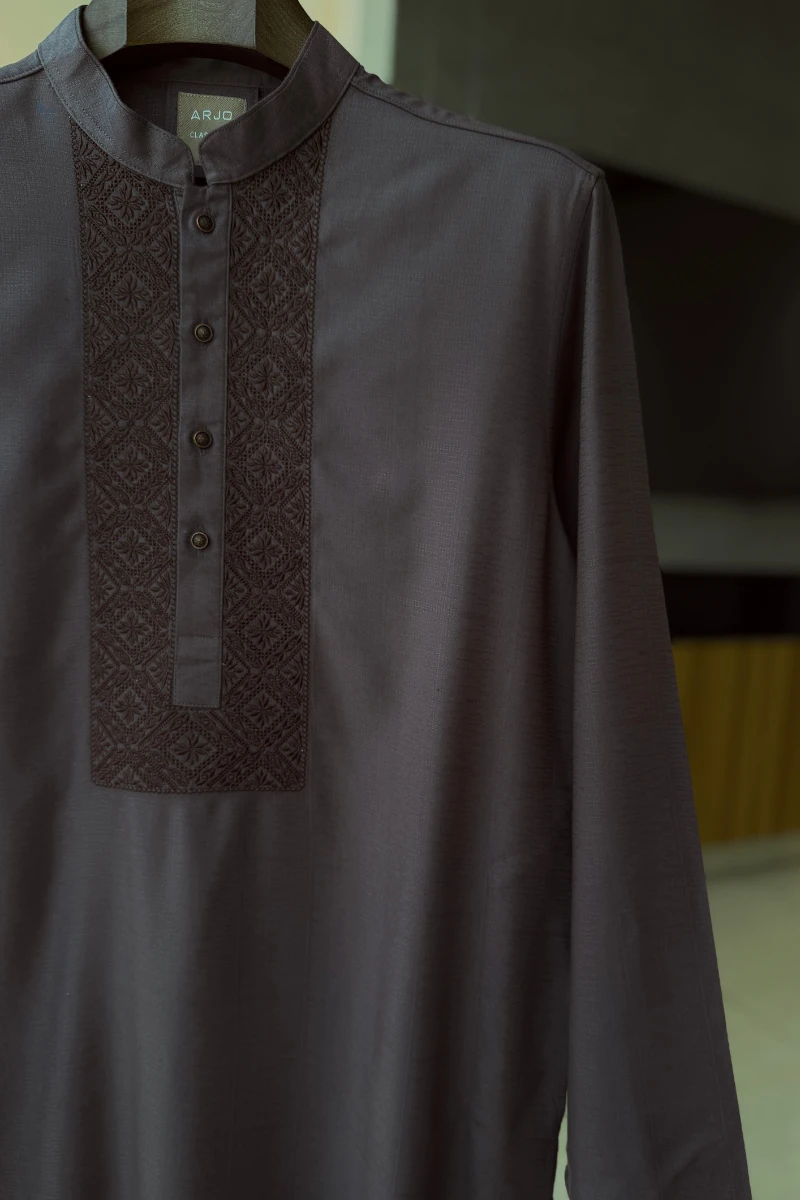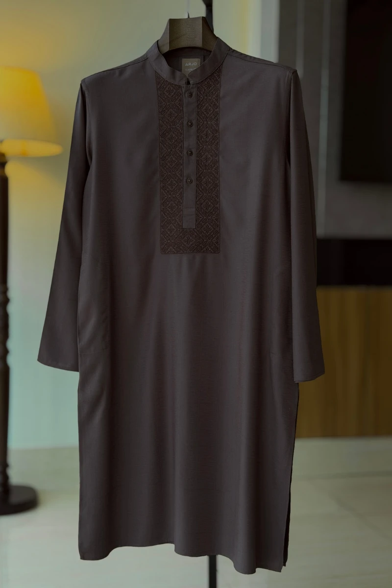Experience timeless elegance with Arjo’s Taupe Grey with Contrast Chocolate Embroidery Panjabi This Panjabi offers a breathable, soft feel, ensuring effortless wear throughout the day. Designed with a tailored fit, it seamlessly blends tradition with modern sophistication, making it perfect for any occasion, be it casual gatherings or festive celebrations. If you're looking for high-quality Punjabi for men in BD, this refined piece is a must-have in your collection. Elevate your style with Arjo today!