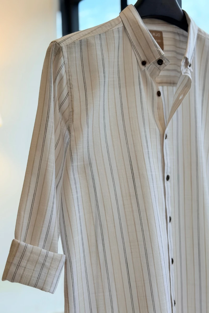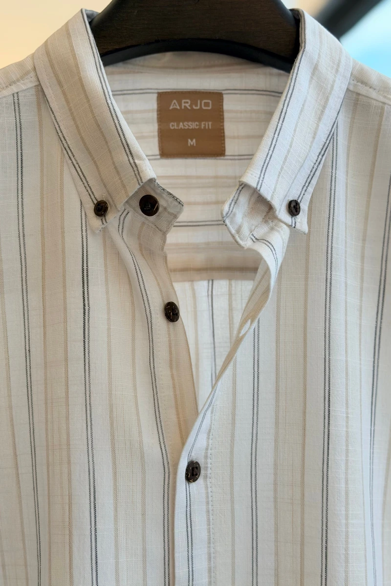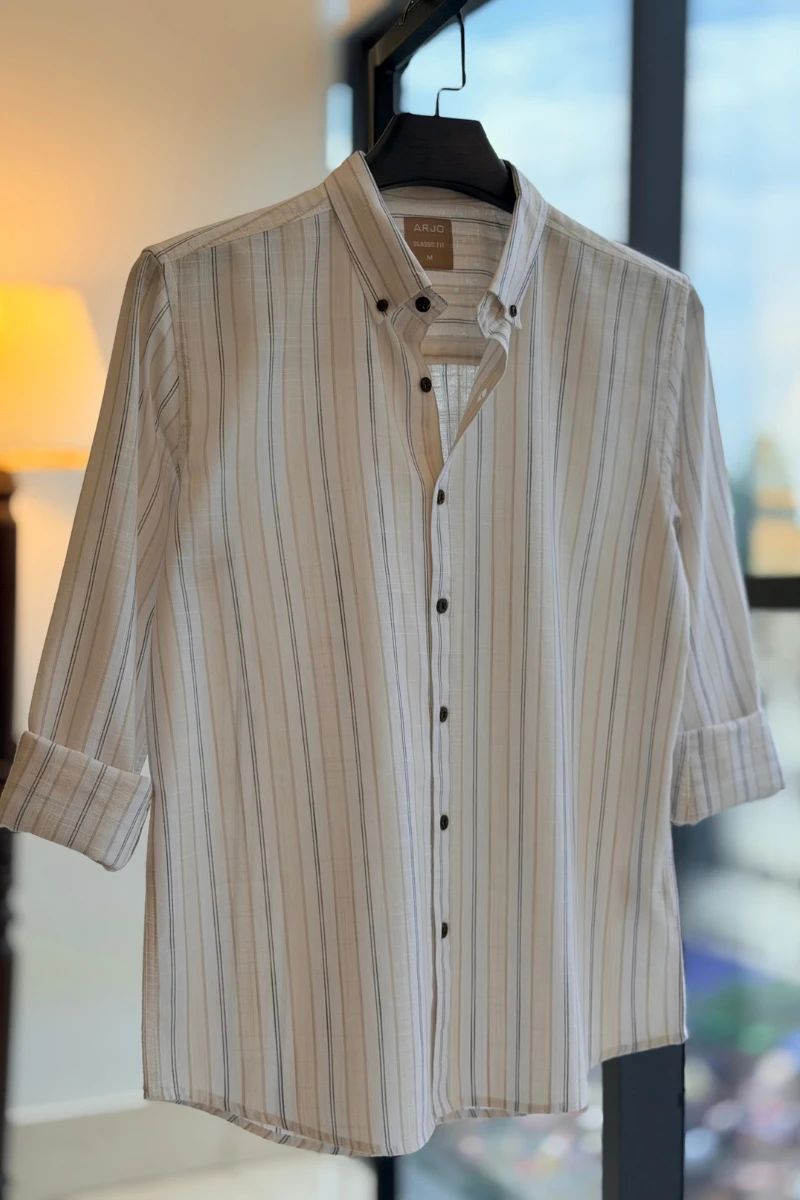 The Warm Off-White Base With Subtle Beige & Black Pinstripes from Arjo is the perfect choice for effortless summer style. Crafted for comfort and breathability, this lightweight shirt keeps you cool during warmer days. With its relaxed fit and timeless stripes, it’s ideal for both casual outings and laid-back occasions. If you're looking for premium Full-sleeve shirts for men in BD, this versatile piece is a must-have. Stay stylish and comfortable all season long with Arjo.