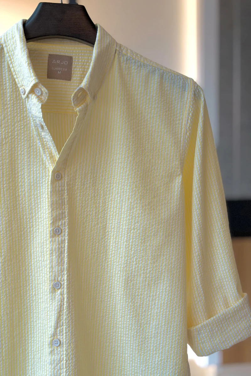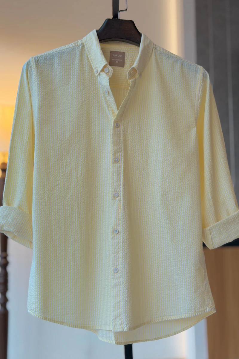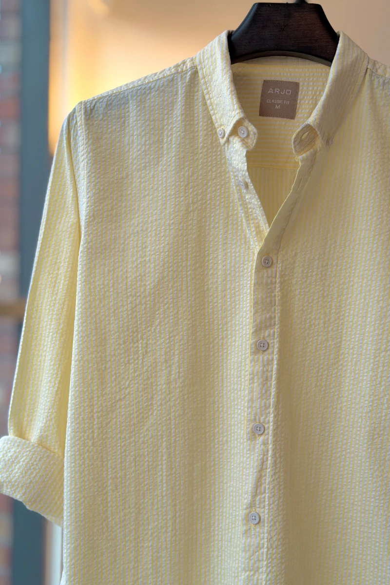 The Yellow With White Stripes Seersucker Shirt from Arjo is the perfect choice for effortless summer style. Crafted for comfort and breathability, this lightweight shirt keeps you cool during warmer days. With its relaxed fit and timeless stripes, it’s ideal for both casual outings and laid-back occasions. If you're looking for premium Full-sleeve shirts for men in BD, this versatile piece is a must-have. Stay stylish and comfortable all season long with Arjo.