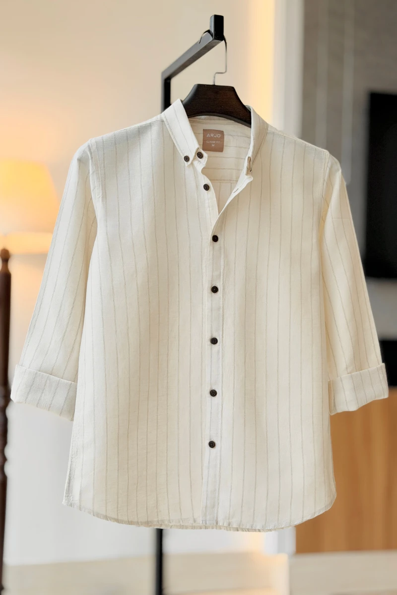 The Cream With Beige Stripes Shirt from Arjo is the perfect choice for effortless summer style. Crafted for comfort and breathability, this lightweight shirt keeps you cool during warmer days. With its relaxed fit and timeless stripes, it’s ideal for both casual outings and laid-back occasions. If you're looking for premium Full-sleeve shirts for men in BD, this versatile piece is a must-have. Stay stylish and comfortable all season long with Arjo.