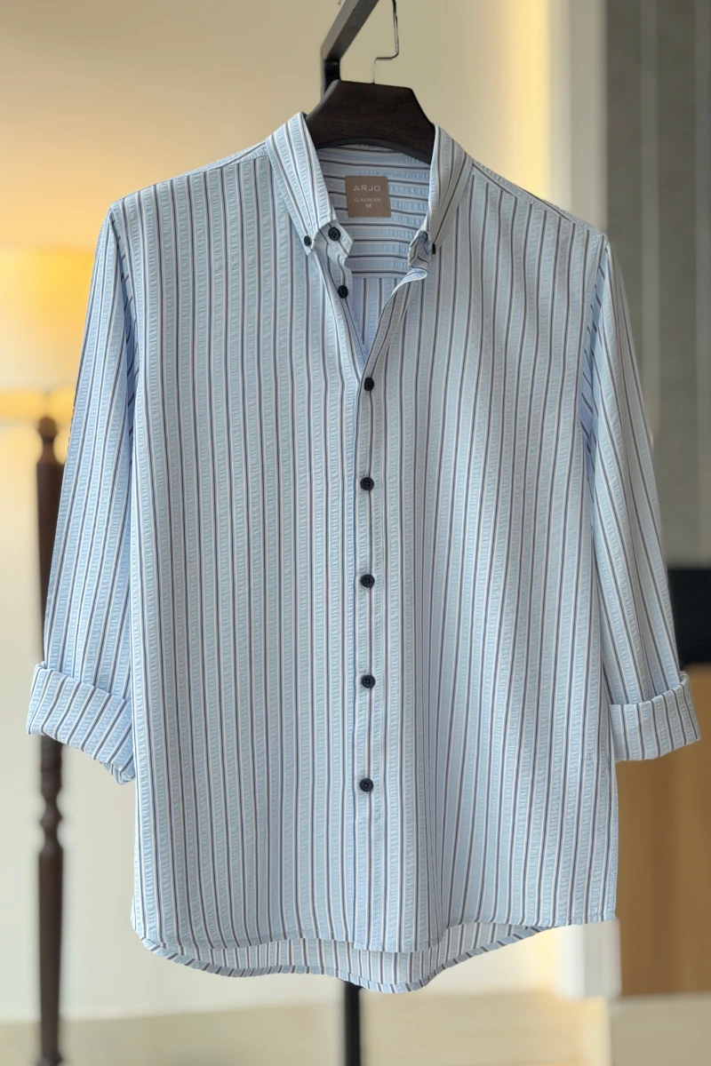 The Light Blue And White Striped Shirt from Arjo is the perfect choice for effortless summer style. Crafted for comfort and breathability, this lightweight shirt keeps you cool during warmer days. With its relaxed fit and timeless stripes, it’s ideal for both casual outings and laid-back occasions. If you're looking for premium Full-sleeve shirts for men in BD, this versatile piece is a must-have. Stay stylish and comfortable all season long with Arjo.