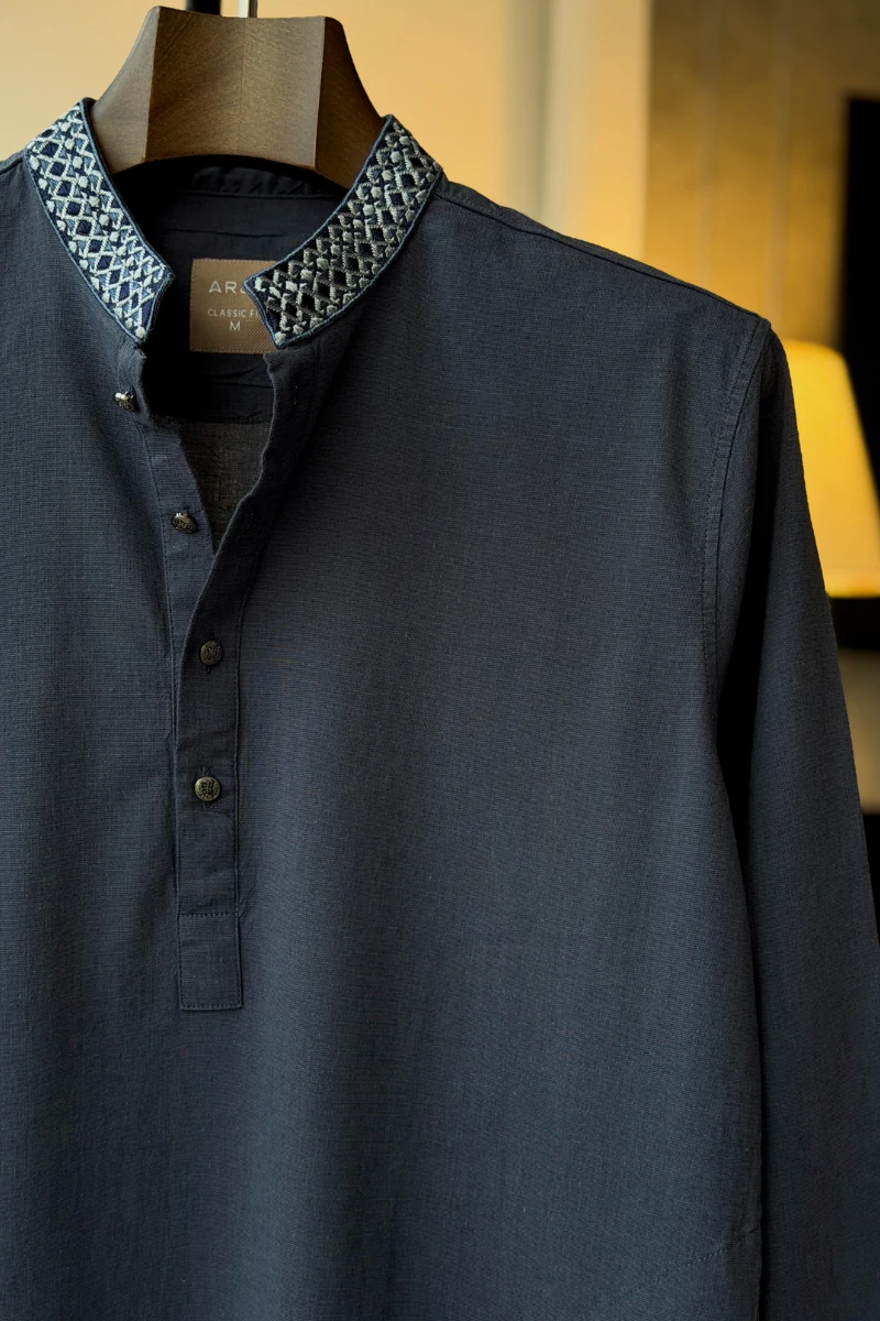 Experience timeless elegance with Arjo’s Midnight Blue with Embroidered Collar Panjabi This Panjabi offers a breathable, soft feel, ensuring effortless wear throughout the day. Designed with a tailored fit, it seamlessly blends tradition with modern sophistication, making it perfect for any occasion, be it casual gatherings or festive celebrations. If you're looking for high-quality Punjabi for men in BD, this refined piece is a must-have in your collection. Elevate your style with Arjo today!