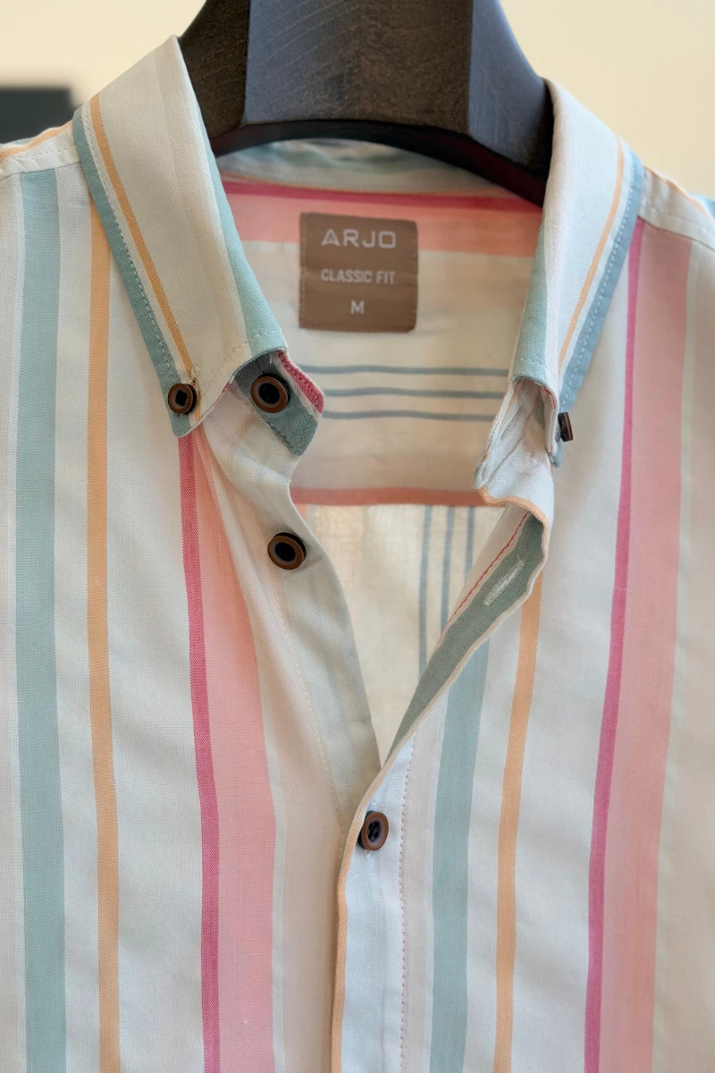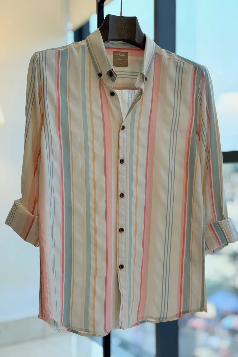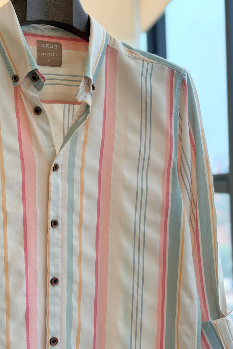 The Multi-Colored Vertical Stripes On a Light Cream Base Casual Shirt from Arjo is the perfect choice for effortless summer style. Crafted for comfort and breathability, this lightweight shirt keeps you cool during warmer days. With its relaxed fit and timeless stripes, it’s ideal for both casual outings and laid-back occasions. If you're looking for premium Full-sleeve shirts for men in BD, this versatile piece is a must-have. Stay stylish and comfortable all season long with Arjo.