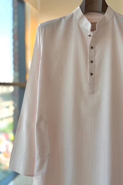 Experience timeless elegance with Arjo’s Pastel Pearl Pink with White Textured Stripe Panjabi This Panjabi offers a breathable, soft feel, ensuring effortless wear throughout the day. Designed with a tailored fit, it seamlessly blends tradition with modern sophistication, making it perfect for any occasion, be it casual gatherings or festive celebrations. If you're looking for high-quality Punjabi for men in BD, this refined piece is a must-have in your collection. Elevate your style with Arjo today!